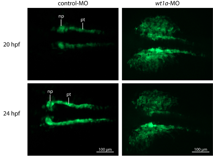 Knockdown of wt1a Disrupts Embryonic Kidney Development. Representative, extended depth of focus images from time-lapse recordings. In control morpholino injected embryos, kidney development shows normal progress with growing tubules and nephron primordia which start to fuse at the midline. In contrast, wt1a morphants fail to form proper nephron primordia and a massive amount of GFP positive cells are outside of the pronephric field. (np, nephron primordium; pt, pronephric tubule).