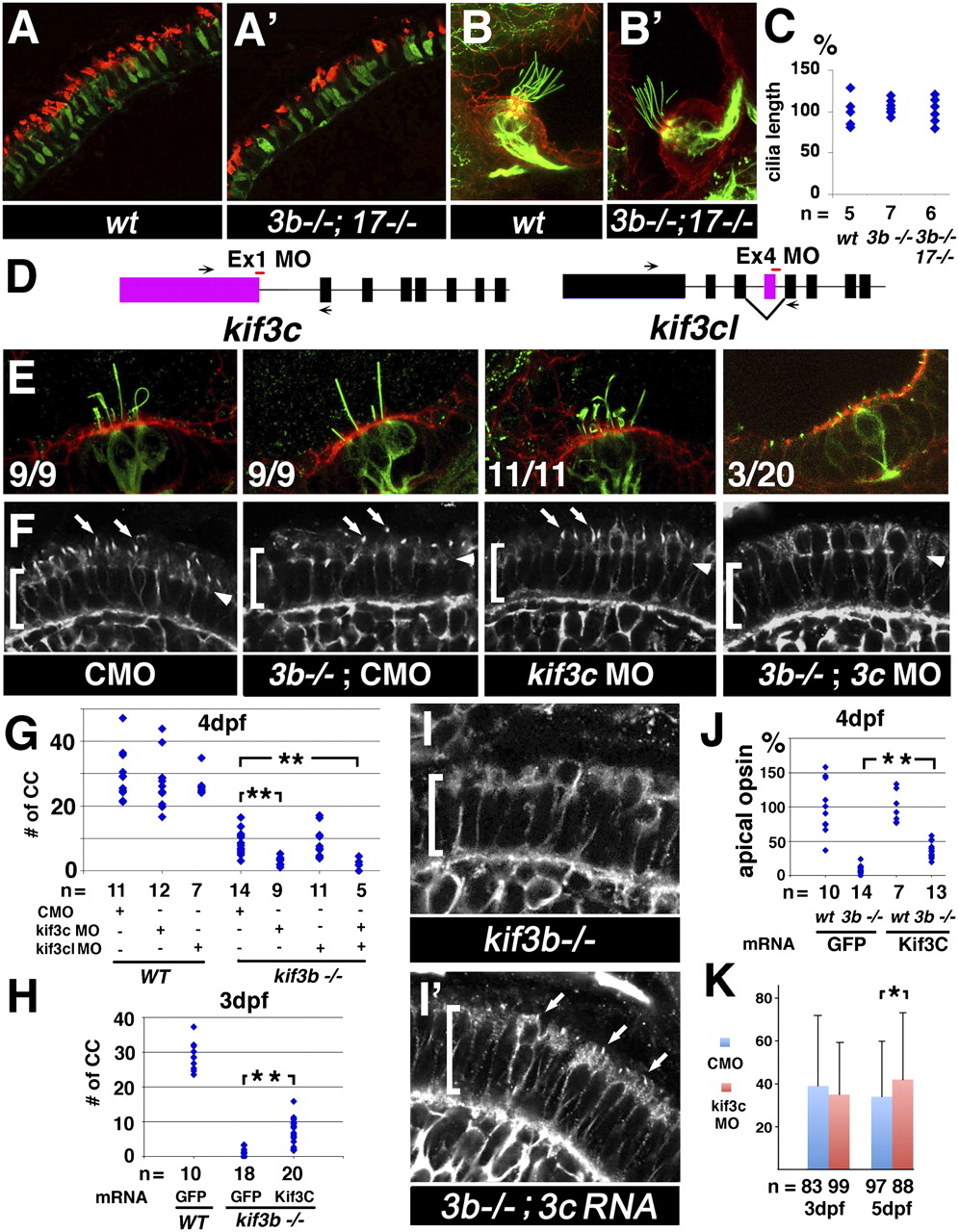 kif3c function in ciliogenesis. (A and A′) Confocal images of transverse cryosections through the retina stained with Zpr-1 (to visualize double cones; green), and anti-green opsin antibodies (red). (B and B′) Confocal images of lateral cristae in whole animals stained with anti-acetylated tubulin antibody to visualize kinocilia (green) and counterstained with phalloidin (red). WT and kif3bjj203-/-;kif17sa0119-/- double mutant animals were analyzed as indicated. (C) Cilia length in WT, mutant, and double mutant cristae as indicated. The average WT length is set at 100%. “n” is the number of individuals analyzed. (D) A schematic drawing of the exon/intron structure for the kif3c and kif3c-like genes. Morpholino-targeted exons are in color. Target sites are indicated as red horizontal bars. (E) Confocal images of lateral cristae in whole animals stained as in B. The number of individuals tested that differentiate cilia is indicated in lower left corner of each panel. (F) Confocal images of transverse cryosections through the retina stained with an anti-acetylated tubulin antibody to visualize cilia (arrows). For E and F, genotypes are indicated below. Brackets indicate the photoreceptor cell layer, arrowheads the outer limiting membrane. (G) The frequency of photoreceptor cilia at 4 dpf in different mutant/morphant backgrounds as indicated. (H) The frequency of photoreceptor cilia in kif3b-/- mutant homozygotes at 3 dpf, following rescue with kif3c or control GFP mRNA. In G and H, each dot represents the number of cilia per an arbitrary segment of the photoreceptor cell layer in a single retina. (I and I′) Confocal images of photoreceptor cilia (arrows) at 3 dpf visualized as in F. (J) Relative sizes of apical opsin-positive compartments (presumably outer segments) in kif3bjj203 homozygous mutant and phenotypically WT animals treated with kif3c or control GFP mRNA. Each dot represents the total size of apical opsin-positive domains on a single section through the retina, adjusted for the length of the photoreceptor cell layer. The average WT size equals 100%. (K) Efficiency of GFP–opsin transport in kif3c morphants measured as in Fig. S1. “n” is the number of photoreceptors analyzed. A minimum of 30 sections from six retinae were used to calculate each data point. In G, H, and J, “n” is the number of retinae analyzed. In all images, apical direction is up (*P < 0.05; **P < 0.001).