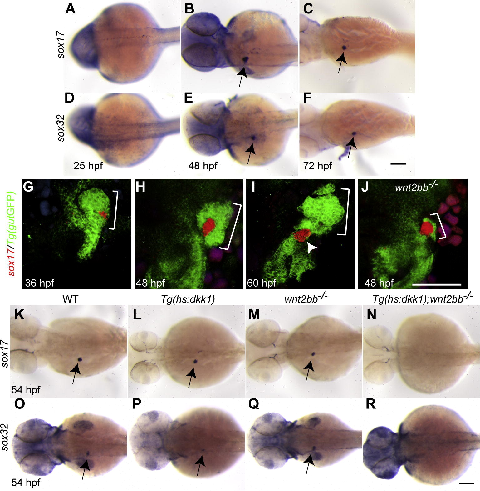 sox17 and sox32 are expressed in the forming liver of wild-type and wnt2bb mutant embryos. (A-F) sox17 (A-C, arrows) and sox32 (D-F, arrows) are re-expressed in the endoderm at 48 and 72 but not 25 hpf. Dorsal views, anterior to the left. (G-J) sox17 in situ hybridization combined with anti-GFP immunostaining in Tg(gutGFP)s854 embryos reveals sox17 expression (red) in the liver (brackets) and later in the gallbladder (I, arrowhead). At 48 hpf, most of the hepatic bud tissue (brackets) in wnt2bb mutants expressed sox17 (J). Ventral views, anterior up. (K-R) Hepatic sox17 and sox32 expression was absent in Wnt/β-catenin signaling deficient embryos (N and R), whereas it was present in wnt2bb mutants (M and Q) andTg(hs:dkk1-GFP) embryos heat-shocked at 18 hpf (L and P). Dorsal views, anterior to the left. Scale bars, 100 µm.