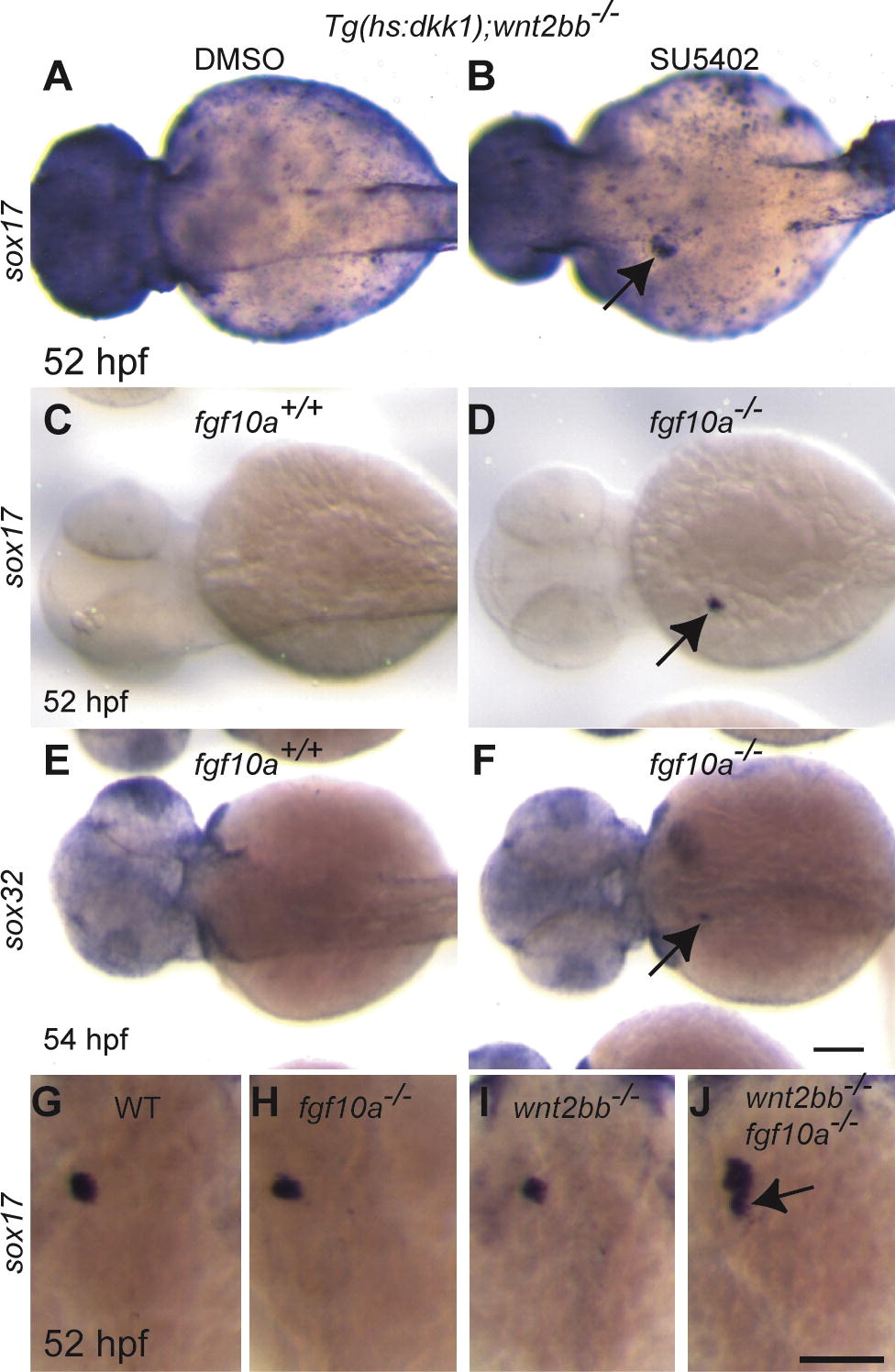 Hepatic sox17 and sox32 expression in wnt2bb mutant and Wnt/β-catenin signaling deficient embryos lacking Fgf10a function. (A-F) Hepatic sox17 expression was present in Wnt/β-catenin signaling deficient embryos treated with SU5402 (1 µM) from 30 to 44 hpf (B) as well as in Wnt/β-catenin signaling deficient embryos lacking Fgf10a function (D). Hepatic sox32 expression was also present in these embryos (F). Dorsal views, anterior to the left. (G-J) There was no clear difference in the hepatic sox17 expression domain among wild-type, fgf10a-/- and wnt2bb-/- embryos (G-I). However, it expanded into the extrahepatic duct region in most fgf10a-/-;wnt2bb-/- (J, five out of seven embryos). Dorsal views, anterior up. Scale bars, 100 µm.