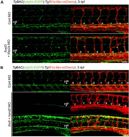 Investigation of the origin of the MCs in trunk vessels. (A) Confocal images of trunk vasculature in the 3 dpf TgBAC(pdgfrb:EGFP);Tg(fli1a:Myr-mCherry) larvae injected with control MO (upper) or both foxd3 and tfap2a MOs(lower). Left, pdgfrb:EGFP; right, the merged images of pdgfrb:EGFP(green) and fli1a:Myr-mCherry(red).(B) Confocal images of trunk vasculature in the 3 dpf TgBAC(pdgfrb:EGFP);Tg(fli1a:Myr-mCherry) larvae injected with control MO (top) or both tbx6 and hand2 MOs (middle and bottom). Left, pdgfrb:EGFP; right, the merged images of pdgfrb:EGFP(green) and fli1a:Myr-mCherry(red).In the bottom panel, GFP signal is intensified to detect the weak signal. HP, hypochord. “a” and “v” indicate arterial ISVs (aISV) and venous ISVs (vISV), respectively. Scale bars, 50 µm.