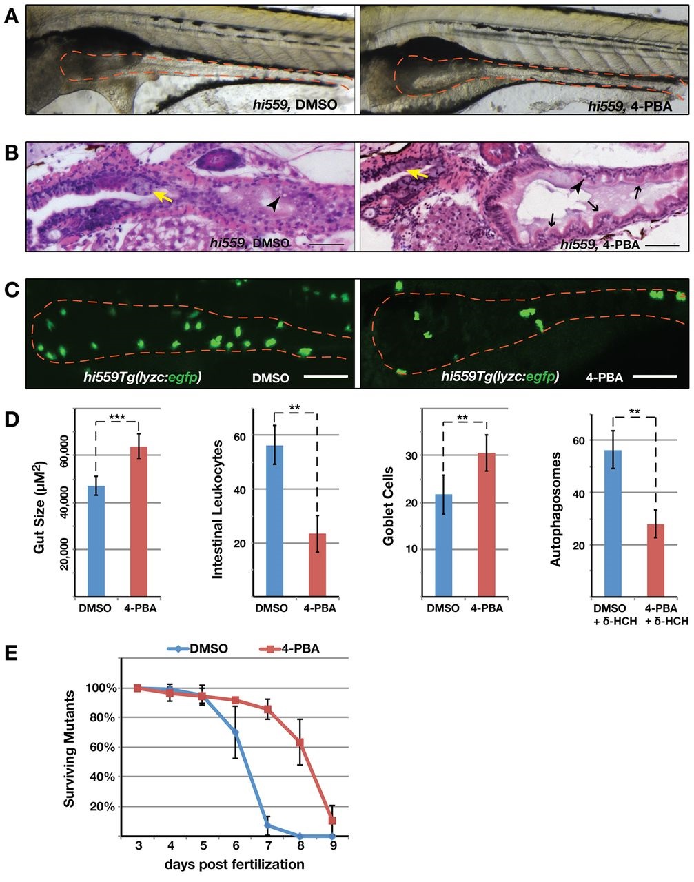 Chemical chaperone 4-PBA rescues the hi559 GI phenotype. (A) Bright-field image of DMSO- and 4-PBA-treated hi559 larvae at 6.5 dpf, showing amelioration of gross intestinal structure (red outline). (B) H&E-stained sagittal sections shows improved villous architecture (black arrows), GCs (yellow arrows) and reduction in mucosal necrosis (arrowheads) in 4-PBA-treated larvae. (C) Confocal projection of hi559Tg(lyzc:egfp) larval intestine (red outline) showing reduction in intestinal leukocyte infiltration in 4-PBA-treated larvae. (D) Bar charts of hi559 larval gut size (n=15), intestinal leukocyte counts in hi559Tg(lyzc:egfp) larvae (n=12) and intestinal autophagosomes (lc3:gfp punctates) in δ-HCH-treated wild-type Tg(lc3:gfp) larvae (n=7) exposed to DMSO or 4-PBA. (E) Survival curve of hi559 larvae treated with DMSO or 4-PBA from 3 dpf through to 9 dpf. Error bars indicate s.d. **P<0.01, ***P<0.001. Scale bars: 20 µm (B); 50 µm (C).