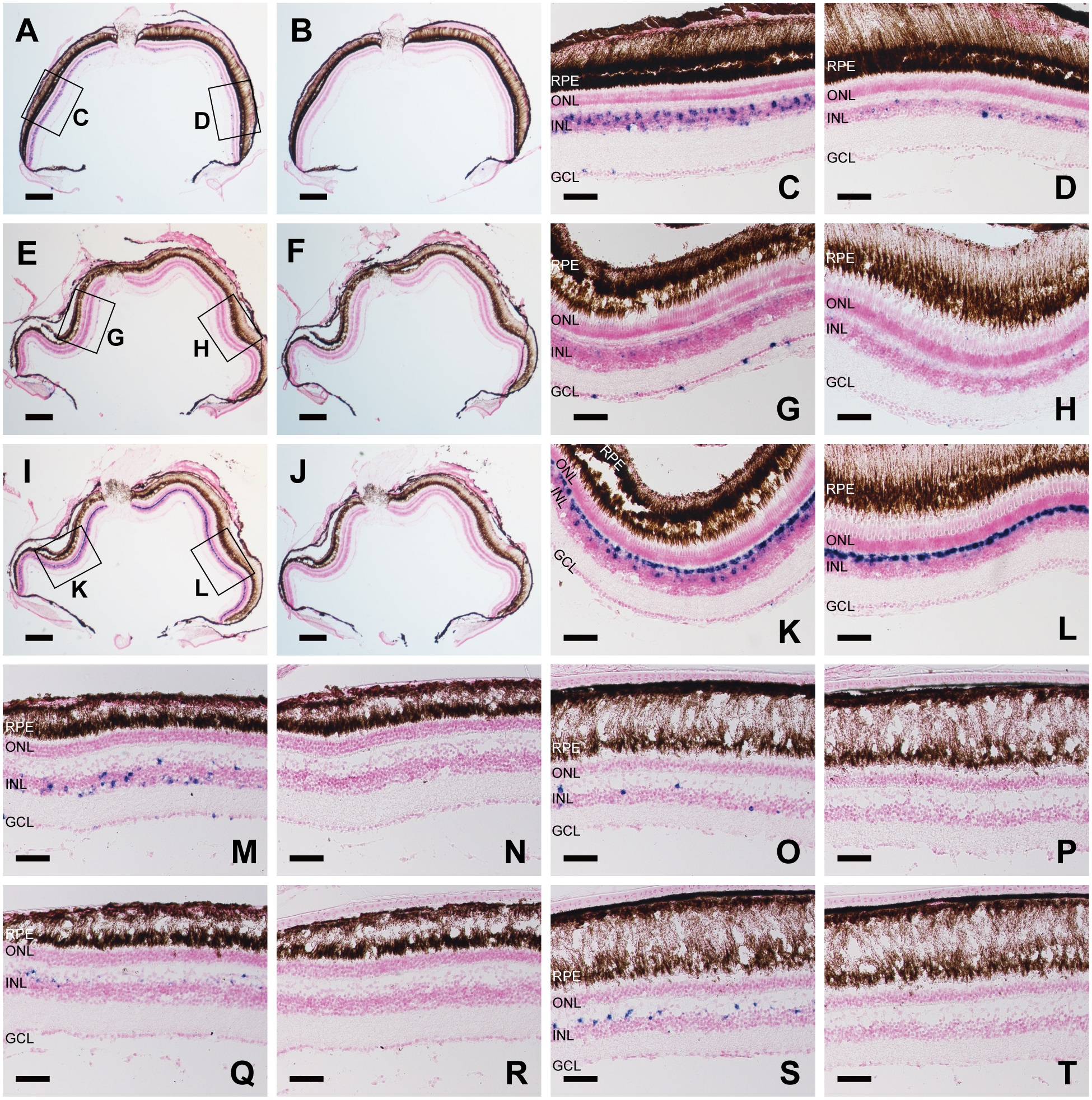 A-D, Detection of medaka fish Opn5m in the retina. Frontal consecutive sections were hybridized with Opn5m antisense (A) and sense (B) probes. Enlarged views of the boxed areas, ventral and dorsal sides, in (A) are shown in (C) and (D), respectively. E-H, Detection of zebrafish Opn5m in the retina. Frontal consecutive sections were hybridized with Opn5m antisense (E) and sense (F) probes. Enlarged views of the boxed areas, ventral and dorsal sides, in (E) are shown in (G) and (H), respectively. I-L, Detection of zebrafish Opn5m2 within the retina. Frontal consecutive sections were hybridized with Opn5m antisense (I) and sense (J) probes. Enlarged views of the boxed areas, ventral and dorsal sides, in (I) are shown in (K) and (L), respectively. M-P, Detection of spotted gar Opn5m within the retina. Ventral regions were hybridized with Opn5m antisense (M) and sense (N) probes. Dorsal regions were hybridized with Opn5m antisense (O) and sense (P) probes. Q-T, Detection of spotted gar Opn5m2. Ventral regions were hybridized with Opn5m antisense (Q) and sense (R) probes. Dorsal regions were hybridized with Opn5m antisense (S) and sense (T) probes. All the sections shown in this figure were counterstained with Nuclear Fast Red. Scale bar: A, B, E, F, I, J, 200 µm; C, D, G, H, K, L, M-T 50 µm