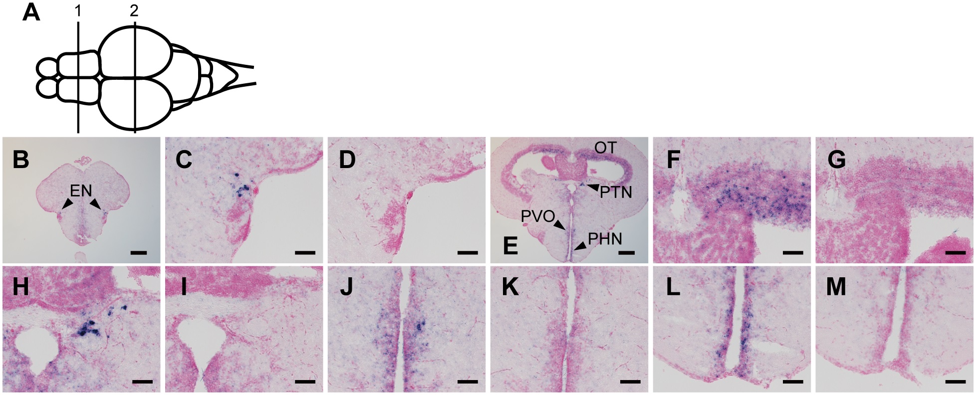 A, Schematic drawing of zebrafish brain, dorsal view. Numbered lines indicate the positions of cross sections shown in B-M. B-M, Localization of zebrafish Opn5m within the brain. Expression signals were detected within frontal sections cut along lines 1 (B), and 2 (E). Sections were hybridized with Opn5m antisense (B, C, E, F, H, J, L) and sense (D, G, I, K, M) probes. Enlarged views of regions around entopeduncular nucleus in panel B, optic tectum, pretectal nucleus, paraventricular organ, and periventricular nucleus in panel E are shown in panels C, F, H, J, and K, respectively. Panels D, G, I, K, and M show consecutive tissue sections to C, F, and I hybridized with Opn5m sense probe, respectively. We could not detect any hybridization signals for Opn5m2 in the zebrafish brain. All sections shown in this figure were counterstained with Nuclear Fast Red. Scale bar: B, E, 200 µm; C, D, F-M, 50 µm.