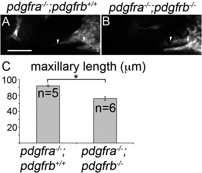 Maxillary domain CNCC length is reduced in pdgfra;pdgfrb mutants at 30 hpf. A,B: Thirty hpf single z-stack confocal images of fli1:EGFP transgenic embryos with indicated genotypes above the panels, anterior is to the left. EGFP-labeling is depicted as gray. The maxillary condensation extends further anteriorly in (A) pdgfra-/-;pdgfrb+/+ embryos compared with (B) pdgfra-/-;pdgfrb-/- embryos (arrowhead denotes length measured). C: Bar chart depicting maxillary neural crest length (Students t-test; *P = 0.0136). Scale bar = 50 µm.