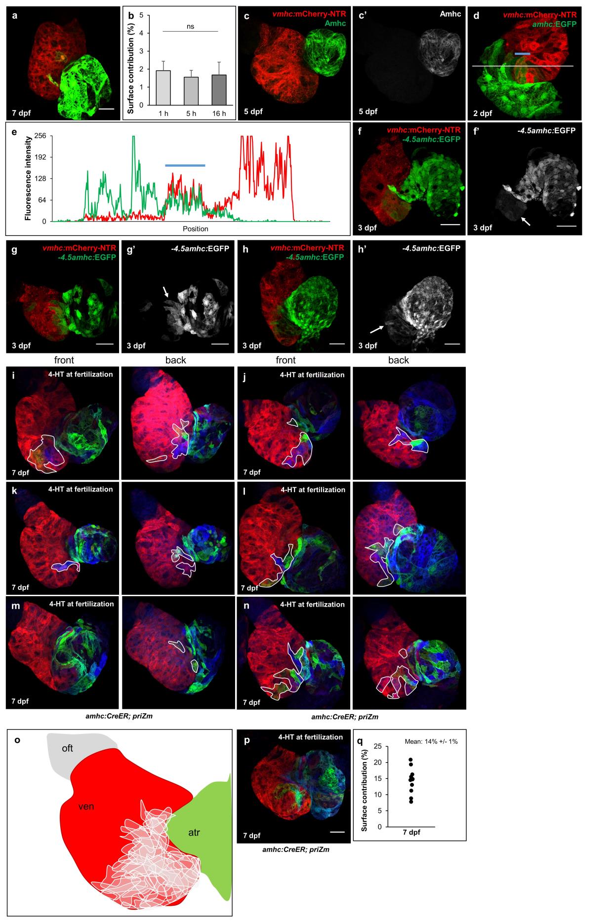 amhc:CreER-expressing cardiomyocytes are transient and localized to the ventricular apex and atrio-ventricular junction. (a) Surface myocardium of a 7 dpf amhc:CreER; β-actin2:RSG heart from an animal treated with 4-HT for 1 hour at 3 dpf, indicating areas of EGFP fluorescence. (b) Percentage of the ventricular surface area with EGFP fluorescence in 7 dpf amhc:CreER; β-actin2:RSG hearts, after treatment with 4-HT at 3 dpf for 1 hour (n = 11 hearts), 5 hours (n = 14 hearts) or 16 hours (n = 9 hearts) (mean +/- SEM). Differences in the means are not significant (ns) by one-way ANOVA (p > 0.05) after arcsine transformation. (c, c′) Surface myocardium of a 5 dpf vmhc:mCherry-NTR heart stained for Amhc, immunofluorescence, indicating no detectable ventricular Amhc. (d, e) Surface myocardium of a 2 dpf amhc:EGFP; vmhc:mCherry-NTR heart indicating some amhc:EGFP fluorescence in the ventricle. White bar indicates measured region for fluorescent intensity profile. Graph plots mCherry and EGFP fluorescent intensity in arbitrary units from 0-256 with position on x-axis indicating distance along the white line in (D). Blue bar indicates a region of EGFP and mCherry co-expression. Scale bars are 50 µm. (f-h) Images of 3 dpf hearts from vmhc:mCherry-NTR animals injected immediately after fertilization with a linearized plasmid containing an EGFP sequence preceded by a 4.5 kb region of the amhc promoter. Arrows indicate regions of EGFP fluorescence in the ventricle. Scale bars are 50 µm. (i-n) Surface myocardium of 7 dpf hearts (front and back) from amhc:CreER; priZm animals treated with 4-HT for 24 hours immediately after fertilization. Non-red cardiomyocytes in the ventricle are outlined in white. (o) Cartoon of generic 7 dpf ventricle overlaid with outlines from (C-H) to demonstrate localization of labeled ventricular cardiomyocytes. (p) Surface myocardium of a 7 dpf heart from an amhc:CreER; priZm animal treated with 4-HT for 24 hours immediately after fertilization. Scale bar is 50 µm. (q) Percentage of the ventricular surface area expressing non-red fluorescent proteins at 7 dpf when treated with 4-HT after fertilization (mean +/- SEM, n = 11 hearts).