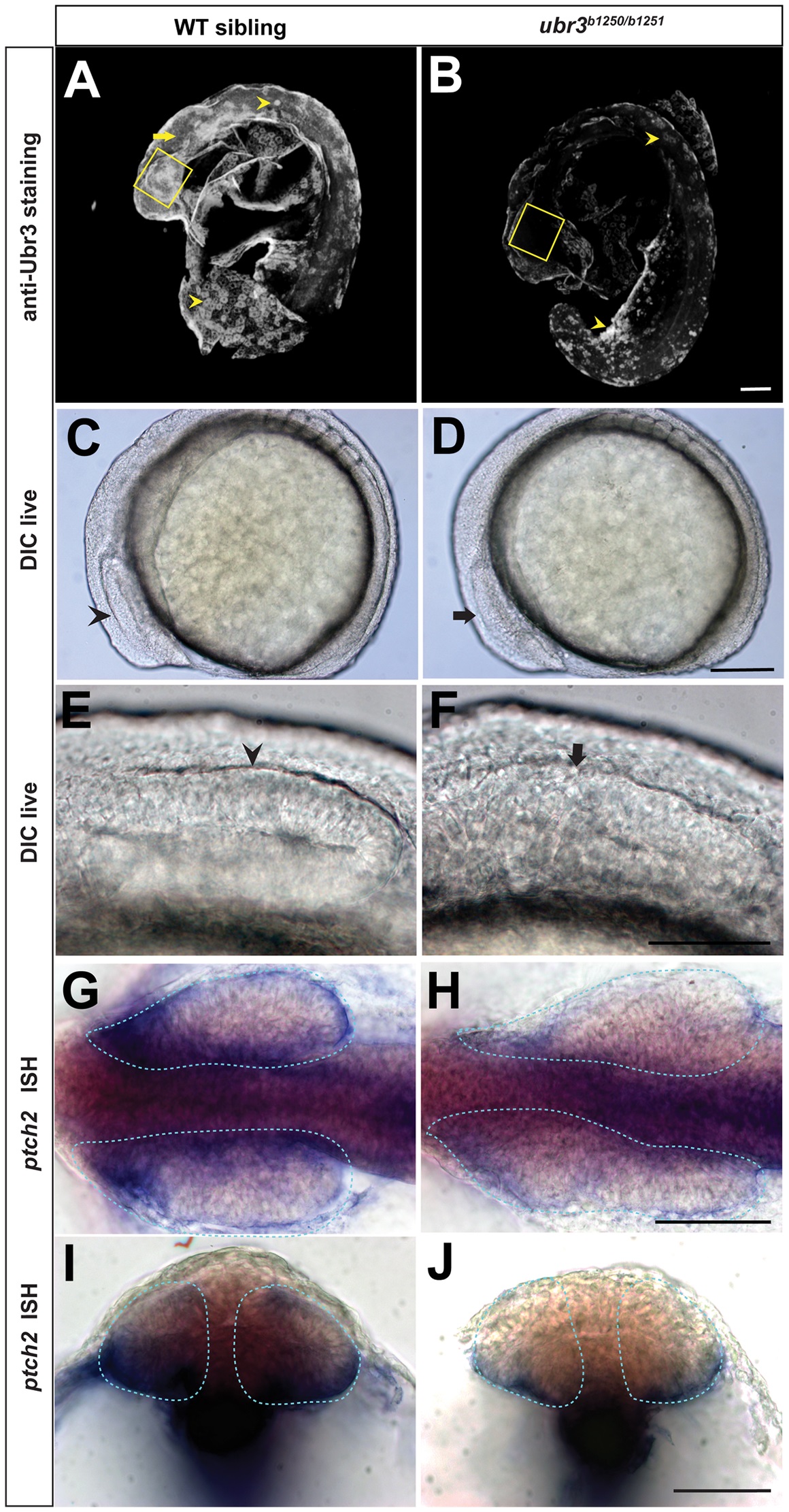 (A-B) Lateral views of zebrafish embryos at 18-somites stage after removing the yolks, labeled with anti-Ubr3 antibody. Boxes outline the zebrafish retina, arrow points to central nervous system. The remaining signal in ubr3b1250/b1251 mutant corresponds to non-specific autofluorescence emanating from the yolk and some peridermal cells (arrowheads). (C-D) DIC (Differential Interference Contrast) imaging showing lateral views of 6-somites stage zebrafish embryos. (C) Wild-type optic vesicle (arrowheads) is morphologically visible and characterized by a stratified epithelial thickening. The cavitation seam divides the presumptive retina into dorsal and ventral halves. (D) ubr3 trans-heterozygous mutant optic vesicle (arrow) has morphological defects characterized by disorganized tissue that lacks epithelial morphology. The cavitation seam is disrupted or absent. (G-J) In situ hybridization for ptch2 in wild-type (G, I) and ubr3 mutant (H, J) zebrafish embryos. Note the down-regulation of ptch2 in ubr3 mutant optic vesicles (dotted area). Dorsal views of flat-mounted zebrafish embryos. (G, H) Cross sections through the optic vesicle of embryos shown in G and H, respectively. All the scale bars represent 50µm.