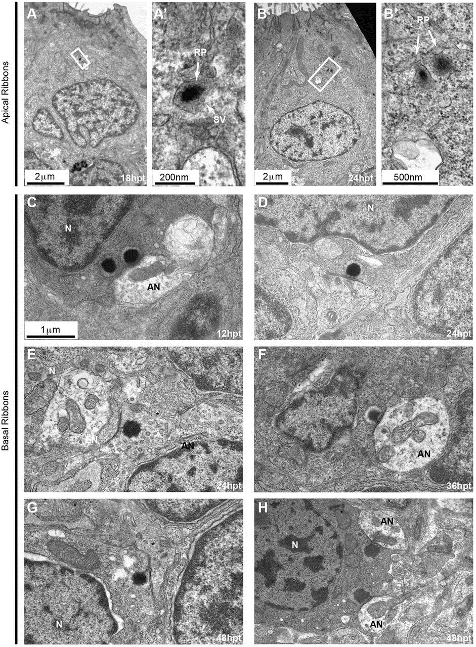 Ultrastructural features of ribbons during hair cell regeneration. (A-I) 5dpf larvae were treated with 400µM neomycin for 1h to kill all hair cells. To assess ribbon morphology during regeneration, larvae were fixed and processed for TEM and anterior lateral line neuromasts were imaged at different times post treatment (hpt). (A-B′) Electron-dense structures indicative of ribbon precursors are found in the cytoplasm of hair cells at early stages (18hpt and 24hpt) during regeneration. (A′,B′) Close up views of boxed regions in A,B. (C-H) Basal ribbons at different stages post treatment. Immature ribbons are seen at early stages such as double ribbons at 12hpt (C) and ‘ectopic’ or ‘floating’ ribbons at 24hpt (E) [the ribbon faces a support cell process (asterisk), which still separates the hair cell from a nearby afferent ending]. The immature ribbon anchored at the membrane at 48hpt (G) faces a growth cone (asterisk), which has the characteristic dense cytoplasm filled with different size vesicles. Mature synapses (D,F,H) were clearly seen from 24hpt to 48hpt. N, nucleus; EN, efferent nerve ending; AN, afferent nerve ending. The images in D-H are shown at the same scale as that in C.