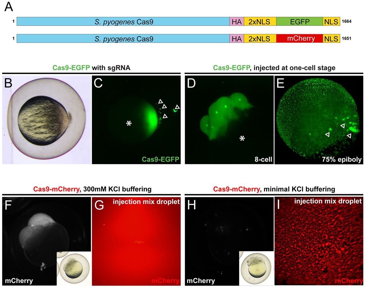 Microinjection of fluorescent Cas9 fusion proteins into zebrafish embryos. (A) Cas9 fusion proteins used in this study, showing the hemagglutinin tag (HA), two nuclear localization signals (NLS), EGFP or mCherry fluorophores, and a third C-terminal NLS. See Fig. S1 for protein sequences. (B,C) One-cell stage zebrafish embryo following microinjection of reconstituted Cas9-GFP-sgRNA complex. Brightfield (B) and EGFP fluorescence (C) reveal precipitated Cas9 complex outside the embryo (arrowheads, C), and strong EGFP fluorescence in the embryo cell without contribution to the yolk cell (asterisk, C). (D,E) Time-course of injected Cas9-EGFP and nuclear localization. Note the even distribution in the developing embryo without yolk fluorescence (asterisk, D) and minimal precipitate inclusions (arrowheads, E). (F-I) Buffering of the Cas9 protein-sgRNA mix with 300mM KCl maintains solubility in the injection mix (F,G) and prevents precipitation before injection (H,I). Insets (F,H) show corresponding brightfield images of fluorescence views.