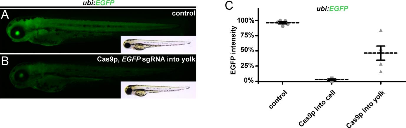 Injection of optimally salt-solubilized RNPs into the yolk decreases mutagenesis efficiency to levels suitable for germline transgenesis. (A) Heterozygous ubi:EGFP control embryo. (B) EGFP mutagenesis using Cas9p and EGFP sgRNA injected into the yolk instead of the cell at the one cell-stage; inserts show brightfield image of fluorescent view. (c) Relative EGFP intensity from cell versus yolk injections.