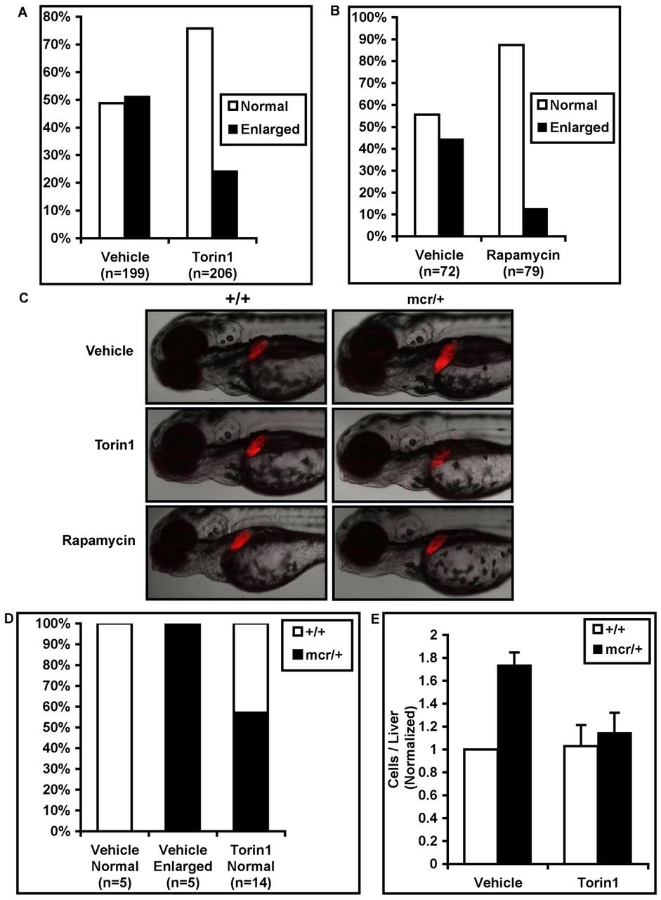 mTORC1 inhibition rescues liver hyperplasia in heterozygous apcmcr/+ zebrafish. Lfabp:rfp zebrafish, which express liver-specific RFP, were mated with apcmcr/+ zebrafish. (A) Resulting progeny (expected 50% apc+/+, 50% apcmcr/+) were treated with vehicle or Torin1 and the percentage of fish with normal or enlarged livers at 3-4 dpf was recorded. Approximately 50% of vehicle-treated fish had enlarged livers, as described previously (Goessling et al., 2008). Torin1 reduced the percentage of fish with enlarged livers. (B) Rapamycin similarly rescued liver enlargement. (C) Representative pictures showing liver enlargement in vehicle-treated heterozygous apcmcr/+ zebrafish but not in Torin1- or rapamycin-treated heterozygotes. (D) Liver size correlated closely with genotype in vehicle-treated embryos, as described previously (Goessling et al., 2008), but heterozygous apcmcr/+ embryos accounted for approximately half of Torin1-treated embryos with normal-size livers, confirming that Torin1 reduces liver size in heterozygous apcmcr/+ embryos. (E) The number of RFP-positive cells per embryo was measured by flow cytometry. Vehicle-treated apcmcr/+ zebrafish had ~75% more hepatocytes than vehicle-treated wild-type fish, and this was rescued by Torin1 treatment.