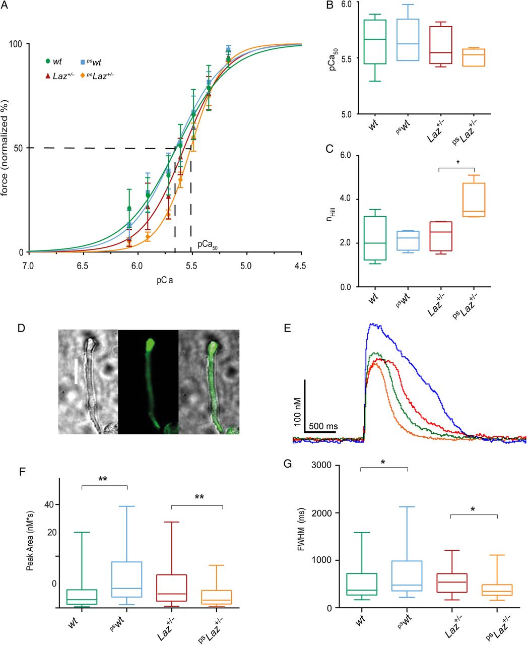 (A) pCa-force relationship, normalized to maximal force (at pCa 4.5). The sigmoidal curves were further analysed for pCa50 and nHill. (B) Quantification of pCa50 from the pCa-force relationship revealed no significant differences. (C) nHill was significantly increased for pslaz+/- compared with wt, pswt, and laz+/- (P < 0.05; N = 5). (D) Intracellular Ca2+-transients were analysed in isolated ventricular cardiomyocytes loaded with Fluo4-AM. Representative brightfield (left) and corresponding fluorescent (middle) and merged (right) images of a single ventricular adult zebrafish cardiomyocyte (scale bar 20 µm). (E) Representative Ca2+-transient traces recorded from wt, pswt, laz+/-, and pslaz+/-. (F) Peak area and (G) full-width half-maximum (FWHM) obtained from the analyses of Ca2+-transients. Data in (F) and (G) were statistically analysed by using ANOVA with Bonferonni post hoc pairwise multiple comparisons *P < 0.05; **P < 0.01; in A-C: N = 5; in E-G: n = 90 cells.