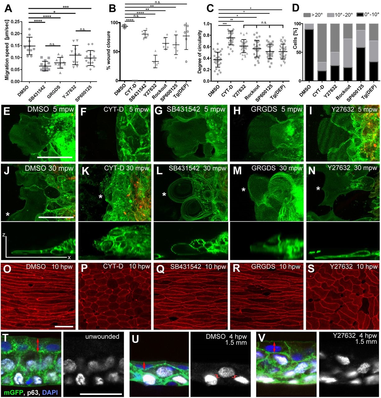 Re-epithelialization requires TGF-β/GRGDS-dependent keratinocyte crawling at the LE and Rock/JNK-dependent epithelial morphogenesis in the following epidermis. (A-D) Quantification of effects caused by the indicated inhibitors on LE migration speeds in partial-thickness wounds (A), and on the extent of wound closure (B), the degree of circularity (C) and the orientation of the long axis (D) of adjacent superficial cells of full-thickness wounds at 10hpw. Tg(DEP), transgenic inhibition of PCP. In A-C, mean values and s.d. are indicated. Values in A were determined from time-lapse movies (e.g. Movies 2-5; n≥5 per condition), values in B from Methylene Blue penetration assays as shown in Fig. S4F,G, and values in C,D from images as shown in O-S. *P<0.05; **P<0.01; ***P<0.005; ****P<0.001; n.s., not significant; one-way ANOVA with a Dunnett′s post-hoc test. (E-N) Live confocal images of the LE of Tg(actb2:hras-egfp), Tg(krt4:mCherry) double transgenic fish at 5min (E-I) and 30min (J-N) after partial-thickness wounding (mpw), treated with indicated inhibitors. Lower panels of J-N show z-projections of the LE cell marked by the asterisk in the panels above. At 5mpw, all cases except the CYT-D treatment display normal protrusive activity at the LE, whereas at 30mpw, SB431542- and GRGDS-treated LE keratinocytes display roundish, shorter and thicker lamellipodia, indicative of lamellipodial retraction. (O-S) Phalloidin staining of the adjacent epidermis of full-thickness wounds at 10hpw demonstrating compromised and uncoordinated cell elongation upon treatment with CYT-D (P) and Y27632 (S), but not SB431542 (Q) or GRGDS (S). (T-V) p63, GFP double immunofluorescence and DAPI labelling of sections through Tg(actb2:hras-egfp) fish at indicated conditions and distances from full-thickness wounds. Left panels, merge; right panels, p63 channels. Y27632-treated wound (V) displays reduced flattening of superficial cells (double-headed red arrows) and reduced frequency of radial intercalations, characterized by a partial overlap of the positions along the epidermal apical-basal axis occupied by adjacent basal and suprabasal p63+ nuclei (marked in U by red lines). Quantifications from three individual fish per condition (1-1.5mm wound distance for U,V) yielded the following frequencies (no. of partially overlapping p63+ nuclei/total no. of p63+ nuclei). Unwounded in T, 6.1±5.3%; DMSO-treated wound in U, 51.3±3.7%; Y27632-treated wound in V, 17.2±4.9%. P=0.00027557 (T versus U); P=0.056567873 (T versus V); P=0.000651499 (U versus V); Student′s t-test. Scale bars: 20µm.