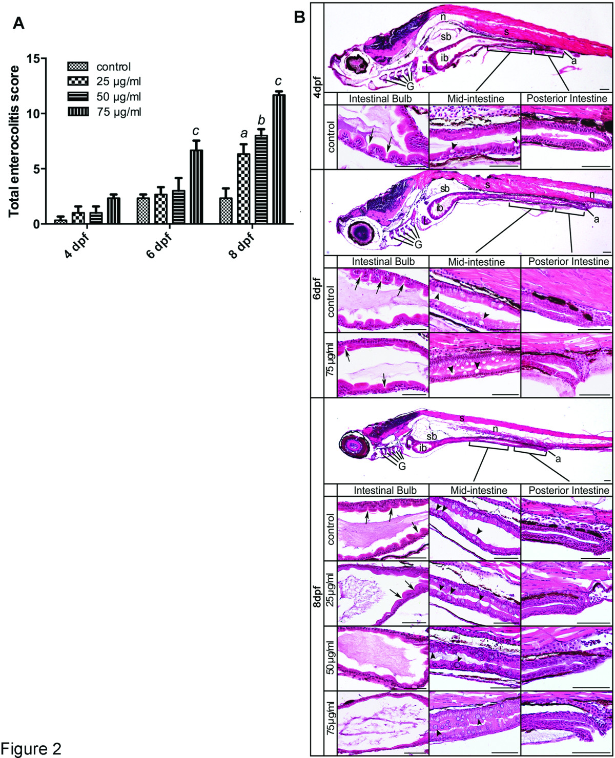 Histological analysis of TNBS-induced enterocolitis. A: Total enterocolitis score of larval zebrafish exposed to different TNBS concentrations (0, 25, 50 and 75 µg/ml) at 4, 6 and 8 dpf. The scores were quantified by a blinded scorer. For each score, a total of 30 folds (10 per intestinal segment) were evaluated per intestine and 6 intestines were evaluated for each experimental group from three independent experiments. All error bars represent as mean ± SEM. n=6 larvae per group, a Indicates a significant difference (p<0.05) between TNBS-exposed group (25 µg/ml) and the control, b Indicates a significant difference (p<0.05) between TNBS-exposed group (50 µg/ml) and the control, c Indicates a significant difference (p<0.05) between TNBS-exposed group (75 µg/ml) and the control, d Indicates a significant difference (p<0.05) between control groups at 6 dpf and 4 dpf, e Indicates a significant difference (p<0.05) between control groups at 8 dpf and 4 dpf. B: Representative haematoxylin-eosin stained sagittal sections of the whole intestine tact and regions of the intestinal bulb, the mid-intestine and the posterior intestine from the statistically significant groups taken at 4, 6 and 8 dpf. In the segment of the intestinal bulb (ib), the lumen expands and the depth of epithelial folds is progressively reduced during TNBS exposure (arrows). The mid-intestine is demarcated by the presence of goblet cells and shows increased numbers with TNBS treatment (arrowheads). No significant changes are shown in the posterior intestine region between control and TNBS-exposed samples. a, anus; ib, intestinal bulb; G, gill arches; L, liver; sb, swim bladder; n, notochord; s, somite. Scale bars, 50 µm.
