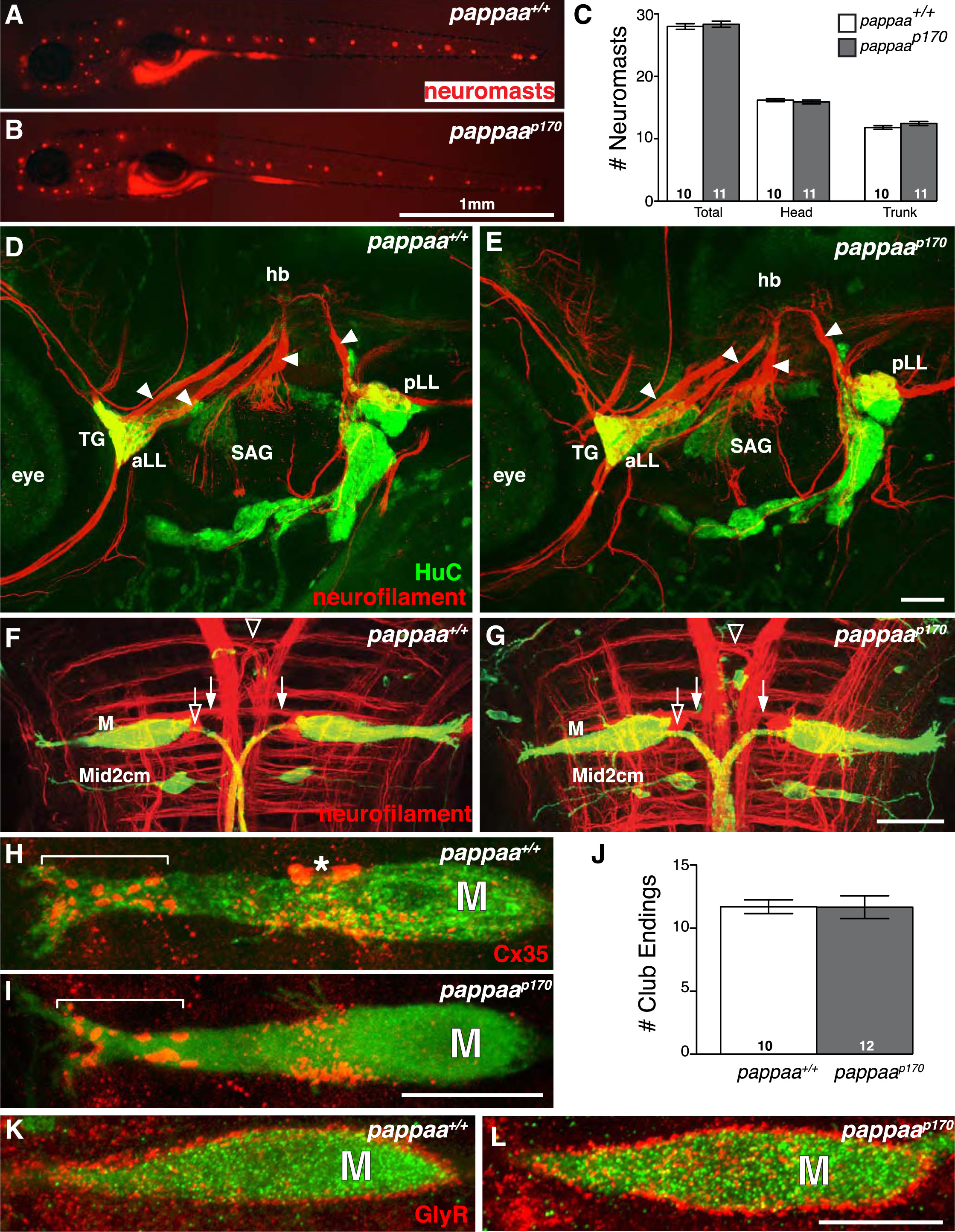(K and L) Glycineric receptors on Mauthner soma. SAG, statoacoustic ganglion; aLL, anterior lateral line ganglion; pLL, posterior lateral line ganglion. N, larvae shown within bars. Error bars indicate SEM. Scale bars = 1 mm (B), 50 µm (E), and 10 µm (G, I, and L).