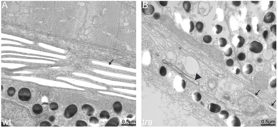 transparent mutant iridophores display characteristics of apoptotic cells. EM sections of wild type (A) and transparent mutant iridophores (B) in the eye of 5 dpf larvae. (A) Wild type iridophores develop stacks of iridosomes nearly completely filling the cells. Iridosomes are not contrasted and appear empty as the guanine crystals are lost during the sectioning process (arrow). (B) Iridosomes are also visible in tra mutants. In the cell shown, only two iridosomes seem to contain guanine crystals (arrows), whereas others contain contrastable material (arrowhead), indicating that guanine deposition is not completed. Importantly and in contrast to wild type, tra mutant iridophores contain many vesicles, a sign for apoptosis. Scale bars: 0.5 mm.