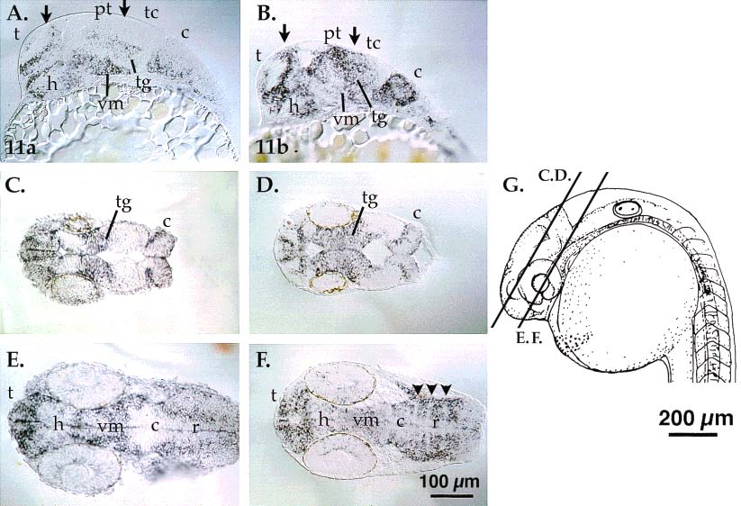 The sox11a and sox11b genes are expressed in overlapping and unique regions of the embryonic brain. A,B: Cells in the dorsal telencephalon, pretectum and tectum express sox11b (B), but not sox11a (A, arrows). Brain regions with similar sox11 gene expression domains include the telencephalon, diencephalon, ventral midbrain, and tegmentum. Ventral midbrain expression of sox11b is weaker than sox11a expression. The arrows indicate domains of differential gene expression in the dorsal telencephalon (left arrow in A and B) and the tectum (right arrows). C,D: sox11a and sox11b are expressed in the tegmentum and the cerebellum. The plane of sectioning is slightly more dorsal in C. E,F: In the ventral brain, ventral mesencephalic cells express sox11a and sox11b. However, sox11a expression is stronger posterior to the hypothalamus (posterior ventral diencephalon) and ventral midbrain than sox11b. Section 5F is a deep horizontal section, and median cells lacking sox expression in the cerebellum are in the floor plate region. A,B sagittal sections; C-F horizontal sections, as indicated in G. t, telencephalon; h, hypothalamus; tg, tegmentum; pt, pretectum; tc, tectum; vm, ventral mesencephalon; c, cerebellum; r, rhombencephalon. Scale bars = 100 µm in A-F, 200 µm in G.