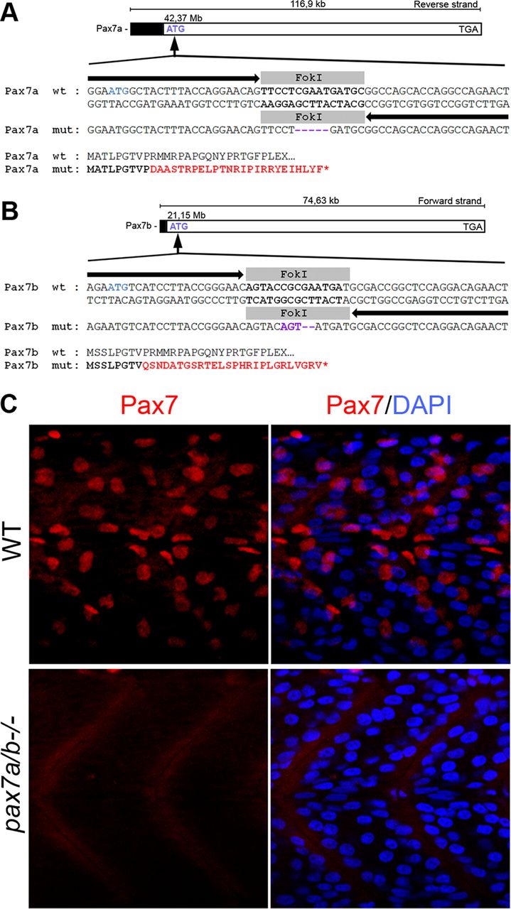 Fig. 1 Generation of pax7a and pax7b mutants using TALENs. Schematic overview of TALEN-induced deletions resulting in frameshift mutations in genes (A) pax7a and (B) pax7b on chromosome 11. Black arrows represent the left and right TALEN sequences, and the gray box represents the spacer sequence indicating the FokI cut site. Purple indicates the insertion of mismatched nucleotides, and red indicates mismatched amino acids. (C) Lateral view of 24-hpf wt embryo and pax7a/pax7b double-mutant trunk immunofluorescently analyzed using a Pax7 antibody (red). DAPI is used to visualize nuclei.