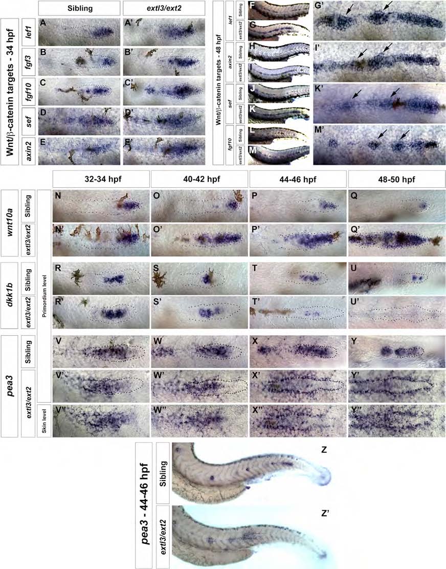 (A-M′) In extl3/ext2 mutants Wnt/β-catenin target genes expand progressively between 34 and 48 hpf.