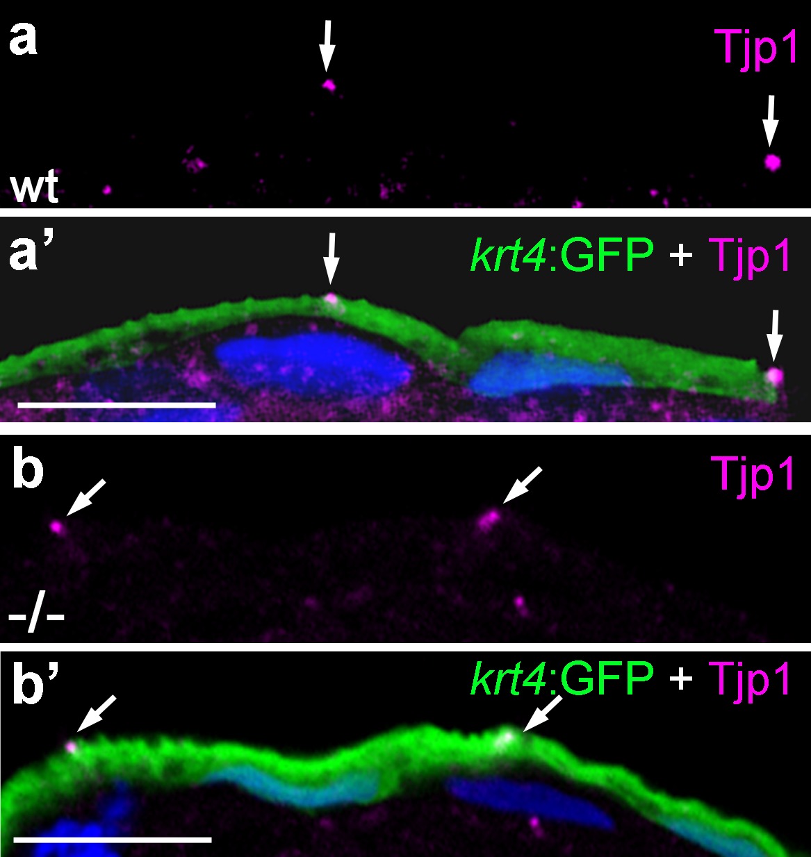 IF of Tjp1 (a,b; magenta) and periderm-specific GFP (a′,b′; green; counterstained with DAPI in blue; merged channels); transverse section through epidermis of wt (a,a′) and psoriasis mutant (b,b′) embryos carrying Tg(krt4:GFP) transgene; 48 hpf., Tjp1 (arrowed) shows unaltered apical localization in peridermal cells of mutant. Scale bar: 10 µm.