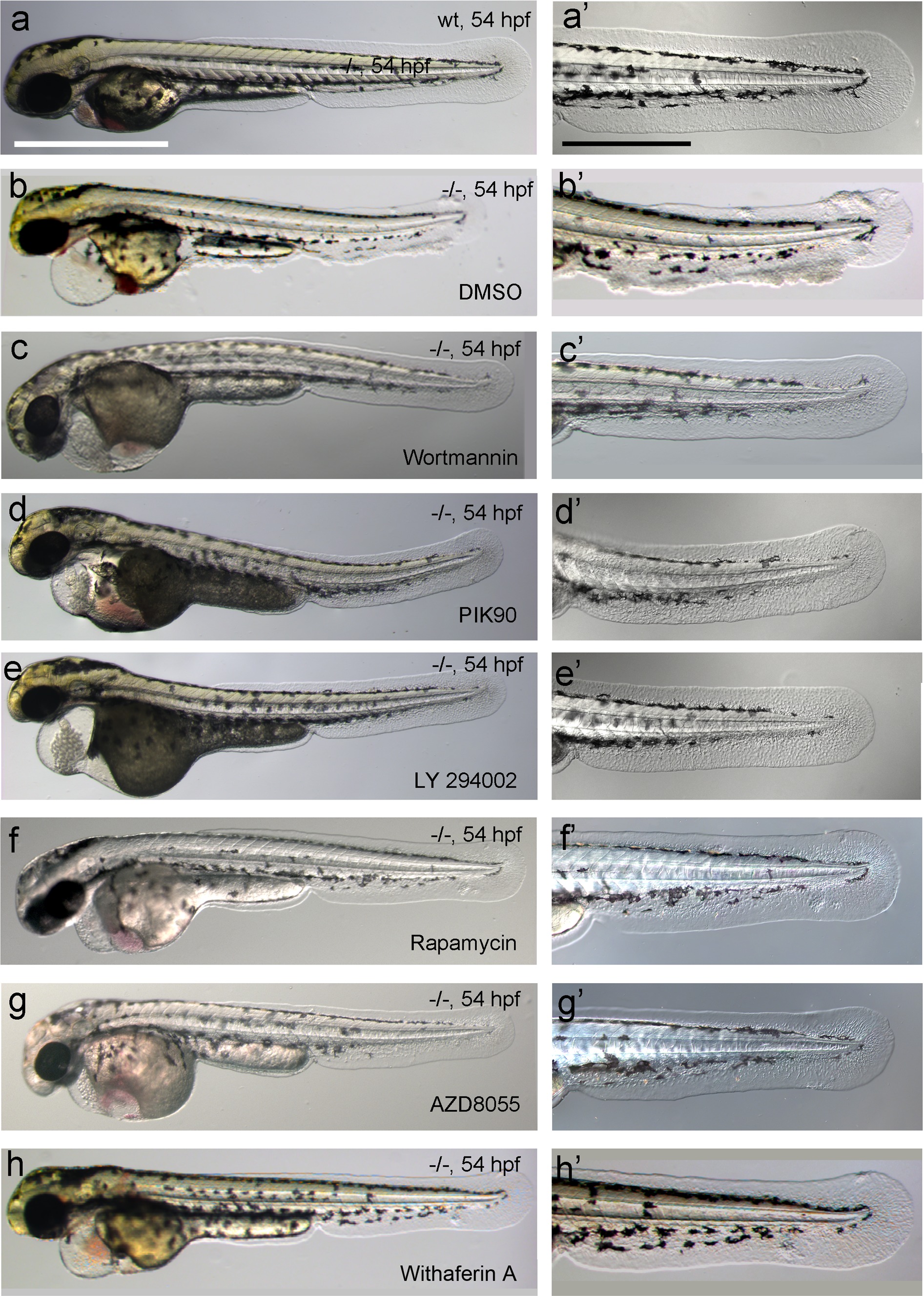 (a-h) Representative live images of psoriasis -/- embryos at 54 hpf, treated with the PI3K inhibitors Wortmannin (1 µM; c,c′), PIK90 (5 µM; d,d′) and LY 294002 (25 µM; e,e′), the mTORC1 inhibitors Rapamycin (1.1 µM; f,f′) and AZD8055 (30 µM; g,g′), and the NFκB inhibitor Withaferin A (30 µM; h, h′), as quantified in Figure 9e. Treatment with the different inhibitors of components of the PI3K-Akt-mTorC1-NFκB pathway do not rescue the pericardial edema (c- h, compare to wt (a) and non-treated mutant (b)), but do rescue the epidermal malignancies of mutant embryos (c′-h′, compare to wt (a′) and non-treated mutant (b′)). Scale bars: 500 µm (a), 250 µm (a′).