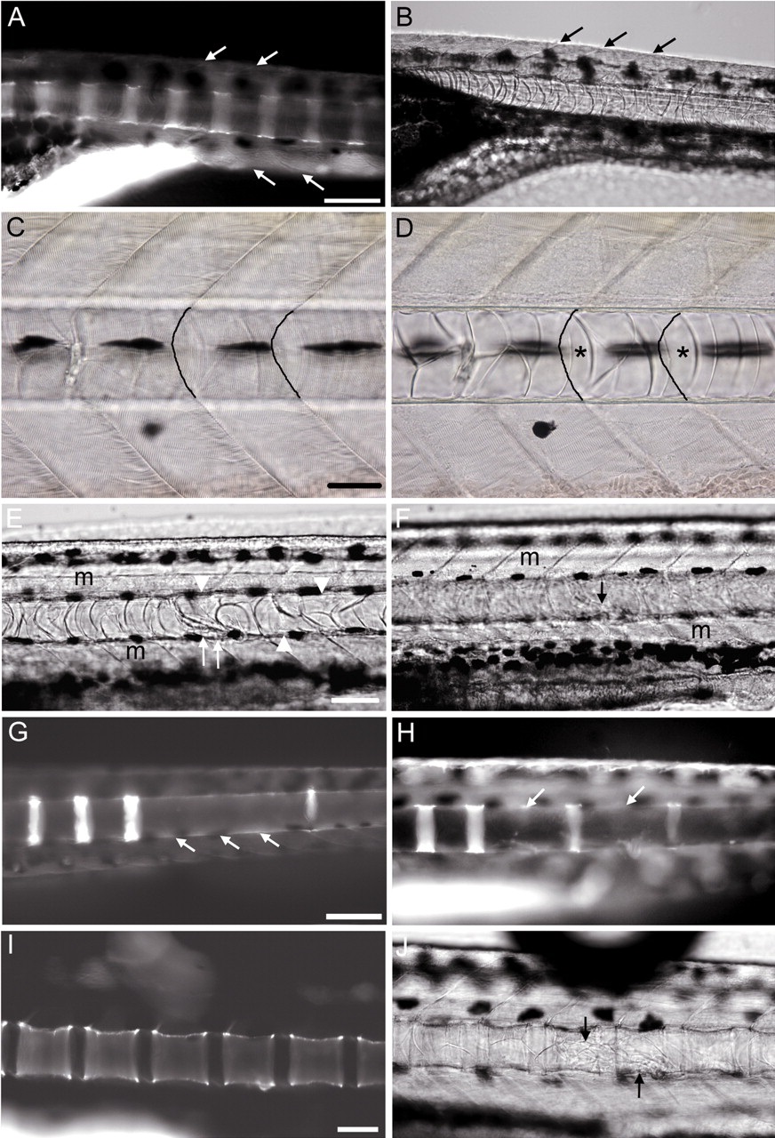 Ablation of notochord cells prevents formation of centra. (A) Unablated embryo (12 dpf) stained with quercetin. Centra appear as stripes along the anterior-posterior axis. (B) DIC image of embryo in A; the anterior boundary of each centrum is level with each myoseptal border (arrows mark the myoseptal border cleft, anterior to left; extrapolation of the arrow vectors in A and B shows the alignment of the V-shaped myoseptal borders with the anterior edges of the developing centra). (C,D) Bright field images of a 4-dpf embryo, showing appearance of notochord cells prior to targeting with the laser. Cross hairs were aligned on the myoseptal borders at the focal plane of muscle segments (C), and the focus was then adjusted to the plane of notochord cells (D). Asterisks denote single notochord cells spanning the diameter of the notochord; these have a typically cylindrical appearance, and would be selected for ablation. The position of two myoseptal borders at the dorsoventral level of the notochord is indicated by dark lines. (E-H) Ablation of notochord cells before centrum formation (at 4 dpf) preventing subsequent development of centra. Cells were targeted at several positions along the anterior-posterior axis, each level with the myoseptal border (16 embryos). (E) DIC image of an embryo after notochord ablation showing the ablation site at 10 dpf (arrows); adjacent notochord cells have altered shape to fill the site (arrowheads). (F) Embryo in E at a focal plane above the notochord showing no damage in adjacent muscle (m); arrow indicates ablation site. (G) Targeting of three notochord cells from consecutive segments prevents development of three centra (arrows); quercetin labelling at 12 dpf. (H) Targeting of notochord cells from alternate segments prevents development of alternate centra (arrows); quercetin labelling at 12 dpf. (I,J) Ablation of notochord cells at 4 dpf in the centre of prospective centra does not affect their development (8 embryos). (I) Quercetin labelling at 20 dpf after ablation at 4 dpf. (J) DIC image of embryo in I, arrows indicate ablation sites. Scale bars: A,B, ~100 µm; C,D, ~50 µm; E,F, ~100µ m; G,H, ~100 µm; I,J, ~100 µm.