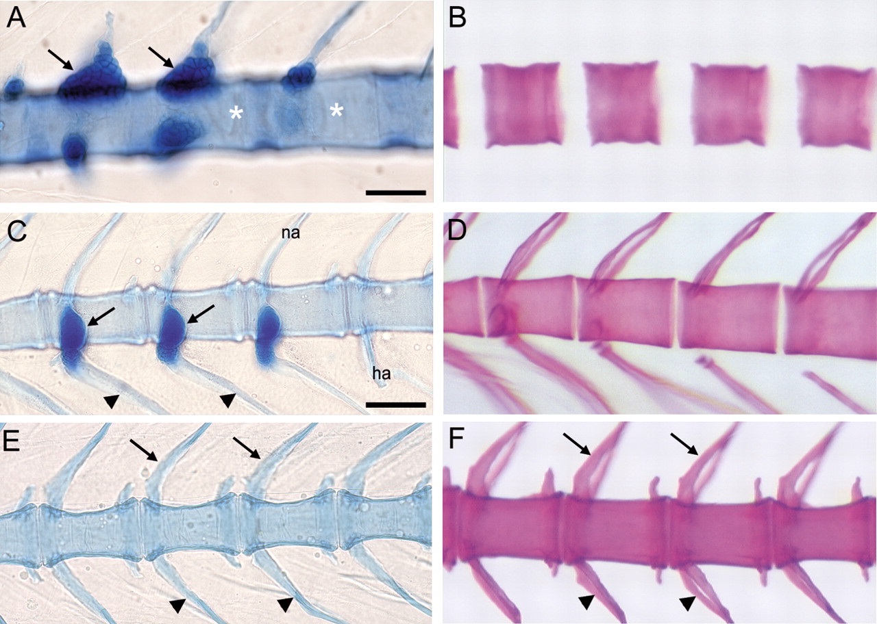 Cartilage and bone formation in the zebrafish vertebral column. (A,C,E) Alcian green staining for cartilage. (B,D,F) Alizarin red staining for bone. (A) At 9 dpf cartilage is only found in the Weberian apparatus (arrows), a specialisation of the four most anterior vertebrae. The Weberian apparatus is described as arising from V1-5 by Morin-Kensicki et al. (Morin-Kensicki et al., 2002), although V1 and V2 give the appearance of a single vertebra in our experiments (see also Coburn and Futey, 1996). Staining is not seen in the centra (asterisks). The weak staining in the bulk of the centra is non-specific, acellular background staining, indicating an absence of chondrocytes and therefore cartilage in these regions. (B) Despite the absence of cartilage, bone is seen in cervical centra at 9 dpf. (C) Cartilage is only seen in the rib heads (arrows) and not in the centra, neural (na) or haemal (ha) arches, or distal ribs (arrowheads) at 17 dpf. (D) Ossified centra are present along the trunk by 17 dpf. (E,F) By 23 dpf, neural (arrows) and haemal (arrowheads) arches have also formed in the tail. Centra and arches ossify without forming cartilage. Scale bars: A,B,~ 50 µm; C-F, ~100 µm.