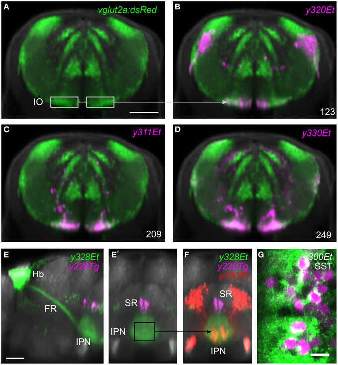 Region of interest search with the brain browser. (A) Transverse view through caudal medulla of vglut2a:DsRed average brain (green). The boxed regions were used to draw a region of interest around the inferior olive (IO) to search the database for Gal4 lines labeling IO neurons. Scale bar 50 µm. (B-D) The three Gal4 enhancer trap lines that most strongly matched the search area (magenta). Each line contained neurons in the region of the IO. (E) Sagittal and (E′) transverse projections of line y328Et (green) which labels the habenula (Hb) and fasciculus retroflexus (FR) including termination zone in the interpeduncular nucleus (IPN). For orientation, a line labeling the superior raphe (SR) is also shown (y228Tg, magenta). The termination zone of habenula neurons in the IPN was used to create a 3D search region. Scale bar 50 µm. (F) Brain browser image showing the result of the 3D search: enhancer trap line y300Et (red) which contained strongly fluorescent cell bodies within the IPN. (G) Single confocal plane showing immunostaining against somatostatin (SST, green) and transgene expression in y300Et (Kaede fluorescence, magenta) within the IPN. Scale bar 10 µm.