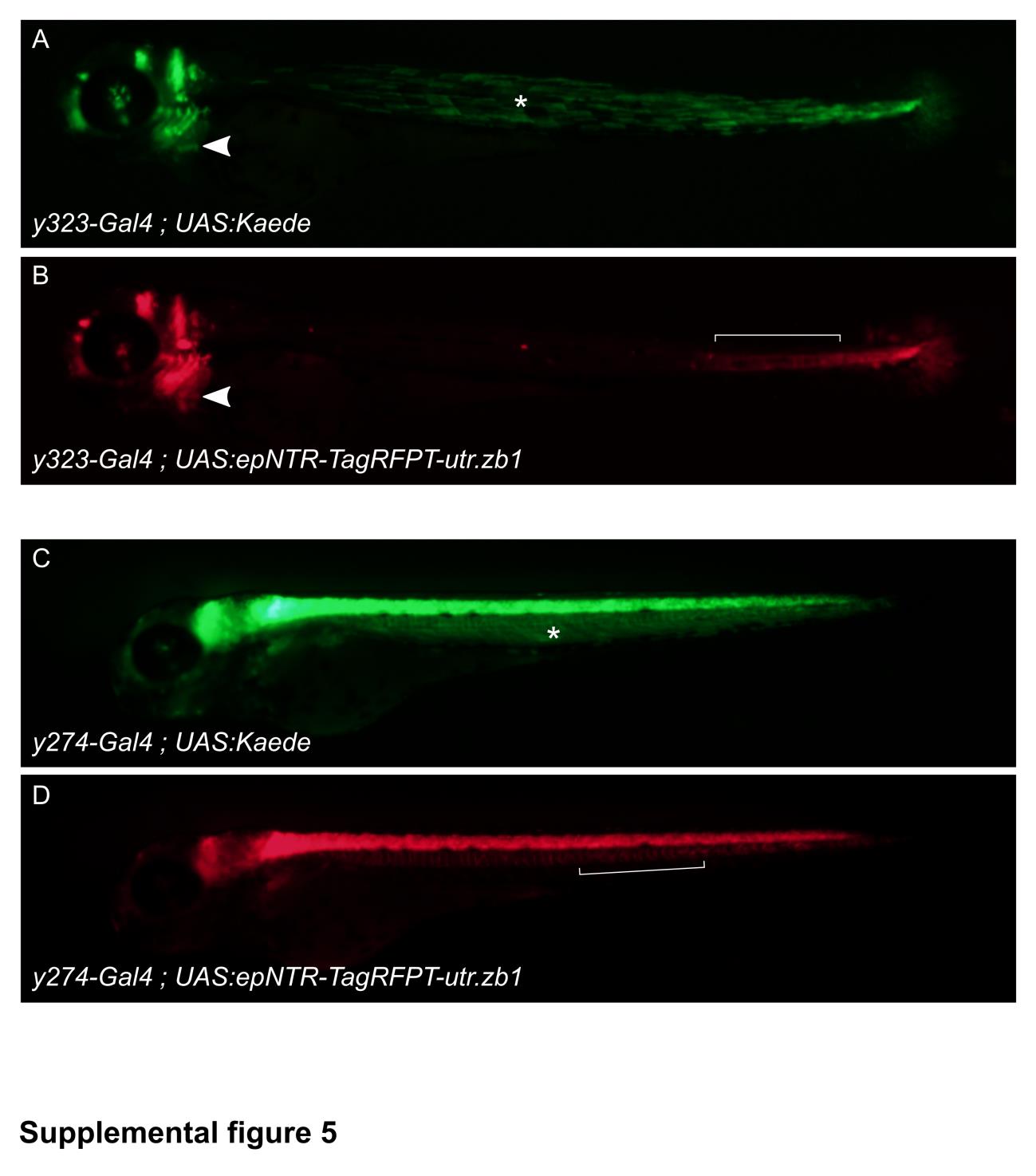 Synthetic 3′ UTR utr.zb1 suppresses transgene expression in muscle. The synthetic 3′ untranslated region utr.zb1 reduces expression in both slow and fast muscle, but not in heart or notochord. Epifluorescence from Kaede (green) and TagRFPT (red) iny323- Gal4, UAS:Kaede, UAS:epNTR-TagRFPT-utr.zb1 (A,B) or y274-Gal4, UAS:Kaede, UAS:epNTR-TagRFPT-utr.zb1 (C,D) embryos imaged at 3 dpf. In y323Et, Gal4 is expressed outside the brain in slow muscle, notochord, heart and caudal fin. Slow muscle (A, asterisk) expression is suppressed by utr.zb1 but expression in notochord (B, bracket), heart (arrowhead), and caudal fin remains intact. Similarly expression of Gal4 in fast muscle is suppressed by utr.zb1in y274Et (C, asterisk), but notochord expression (D, bracket) is not diminished.