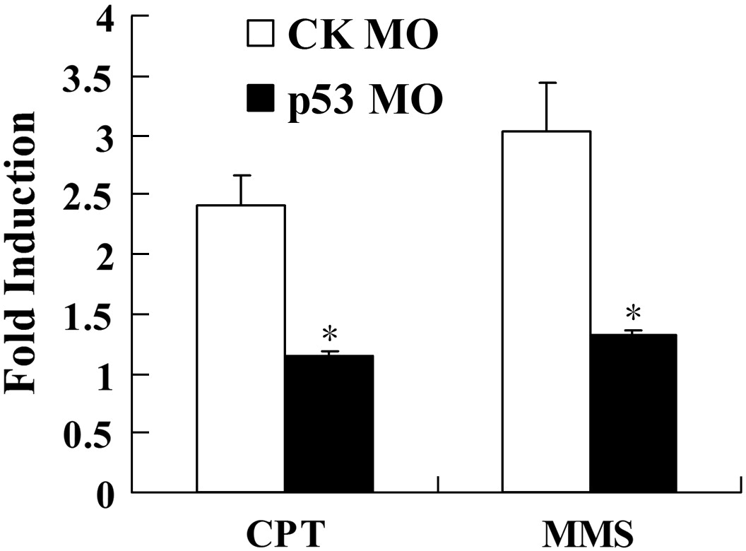 Knockdown of p53 suppresses the DNA damage-induced expression of zebrafish rrm2b gene. Embryos at one-cell stage were injected with 1.5 ng of p53 MO or the standard control (CK) MO. Developing embryos at 24 hpf were treated with 2 µM of CPT or MMS for 6 h and collected for total RNA extraction. Real-time PCR was then performed to determine the expression of p53R2. The ratio of p53R2 to β-actin in untreated embryos was set to 1 in each group, and all treated embryos were normalized relative to this value. Data are expressed as means ± SD from three independent experiments. * indicated p < 0.05 versus the control.