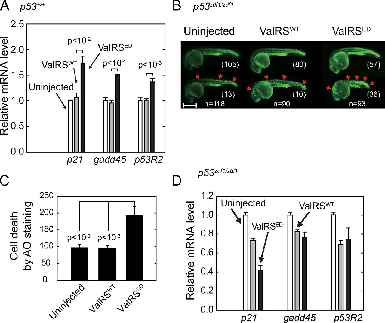 ED ValRS activates p53 in zebrafish. (A) RT-PCR results of p53 downstream markers p21, gadd45, and p53R2 in ValRSWT or ValRSED mRNA-injected zebrafish. The bar graphs show the mean values ± SEM after normalization to the β-actin level. (B) Uninjected (n = 118), ValRSWT mRNA-injected (n = 90), or ValRSED mRNA-injected (n = 93) p53zdf1/zdf1 zebrafish were stained with AO at 1 dpf. The red arrows show points of cell death. Zebrafish are aligned based on cell death severity. (Scale bar, 500 µm.) (C) Quantification of AO staining. Bars represent mean ± SEM. (D) RT-PCR results of p53 downstream markers p21, gadd45, and p53R2 in p53zdf1/zdf1 zebrafish injected with either ValRSWT or ValRSED mRNA. The bar graphs show the mean values ± SEM after normalization to the β-actin level.