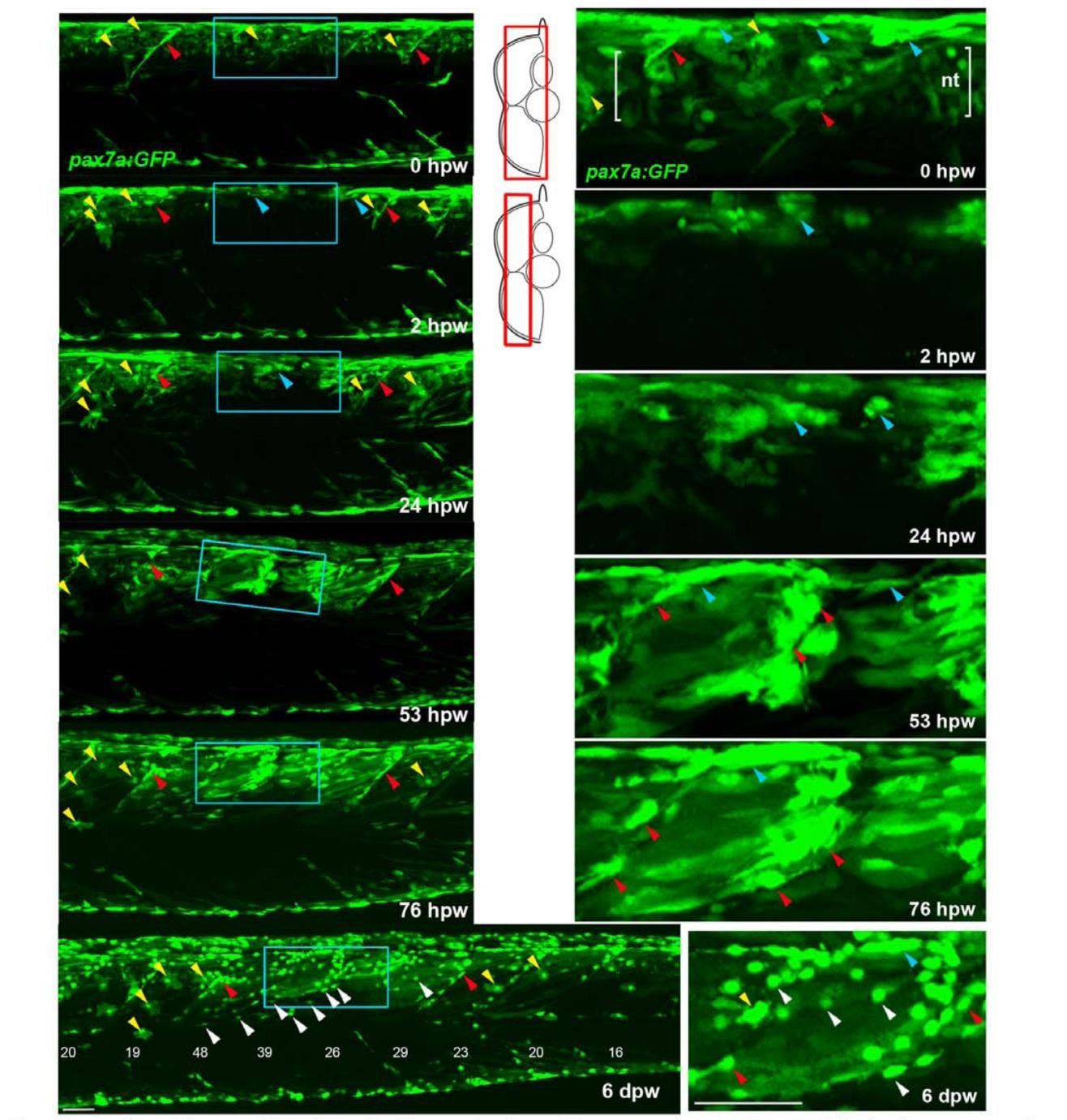 Genetically marked pax7a-expressing cells contribute to regeneration. Tg(pax7a:GFP):pfe/pfe zebrafish larva was wounded at 4 dpf in the epaxial region of somites 16-19 and repeatedly confocally scanned live, embedded in agarose. Maximum intensity projections of selected regions of the stack are shown in lateral view, anterior to left, dorsal up. Only top panel includes neural tube levels (red boxes in schematics). Blue boxed regions, magnified at right, show GFP+ cells near dorsal epaxial edge in central somite 16 at 1 dpw yielding thin muscle fibres by 2 dpw (blue arrowheads). Prior to wounding (top panels), GFP is present in cells of neural tube (nt. between brackets), dorsal and vertical somite borders (blue and red arrowheads, respectively) and rare xanthophores (yellow arrowhead). In contrast to the larva in panel S6A, GFP recovers more rapidly in central wounded somites (blue box) that had GFP+ cells spreading from dorsal epaxial edge at 24 hpw (blue arrowheads). pax7a:GFP+ cells began to re-accumulate at the dorsal edge by 1 dpw and fibre formation was well underway by 2 dpw. As nascent fibres matured and increased in volume, their GFP fluorescent intensity declined, while small myogenic cel ls remained strongly labelled. In contrast to the larva in panel S6A, GFP recovers more rap idly in central wounded somites (blue box) that had GFP+ cells spreading from dorsal epaxial edge at 24 hpw (blue arrowheads). At 6 dpw, when wound repair was advanced, numerous small round GFP+ cells (white arrowheads) appear in all somites overlying the myotome, in the dermomyotome location. These cells were more numerous in wounded somites than in adjacent unwounded somites, and concentrated at the posterior somite border. In summary, pax7a-expressing myogenic cells contribute to muscle repair and a sub-population of such cells remains undifferentiated after myotome recovery. Bar = 50 µm .