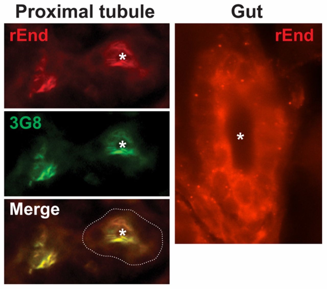Rat endolyn is targeted to the apical surface of the zebrafish proximal tubule. mRNA encoding wild-type rat endolyn (200ng) was injected into zebrafish embryos at the one-cell stage. Embryos were fixed at 48 hpf, sectioned and incubated with polyclonal anti-rat endolyn (rEnd) and monoclonal 3G8 antibodies (to mark the apical surface of proximal tubules) as described in Materials and Methods. Cross sections through the proximal tubule and gut are shown. The periphery of the proximal tubule is outlined in the merged image and the lumen is marked by an asterisk.