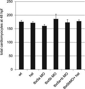 Cardiac cell number is not affected by the lack of functional Tbx5a or Tbx5b. Quantification of total cardiomyocyte numbers in wild-type (wt) and tbx5a or tbx5b-deficient embryos at 48 hours postfertilization (hpf). Data are expressed as means ± SE. There were no statistically significant differences among these treatments (*P > 0.05). For the columns listed left to right, n = 20, 11, 17, 11, 20, 14 embryos.