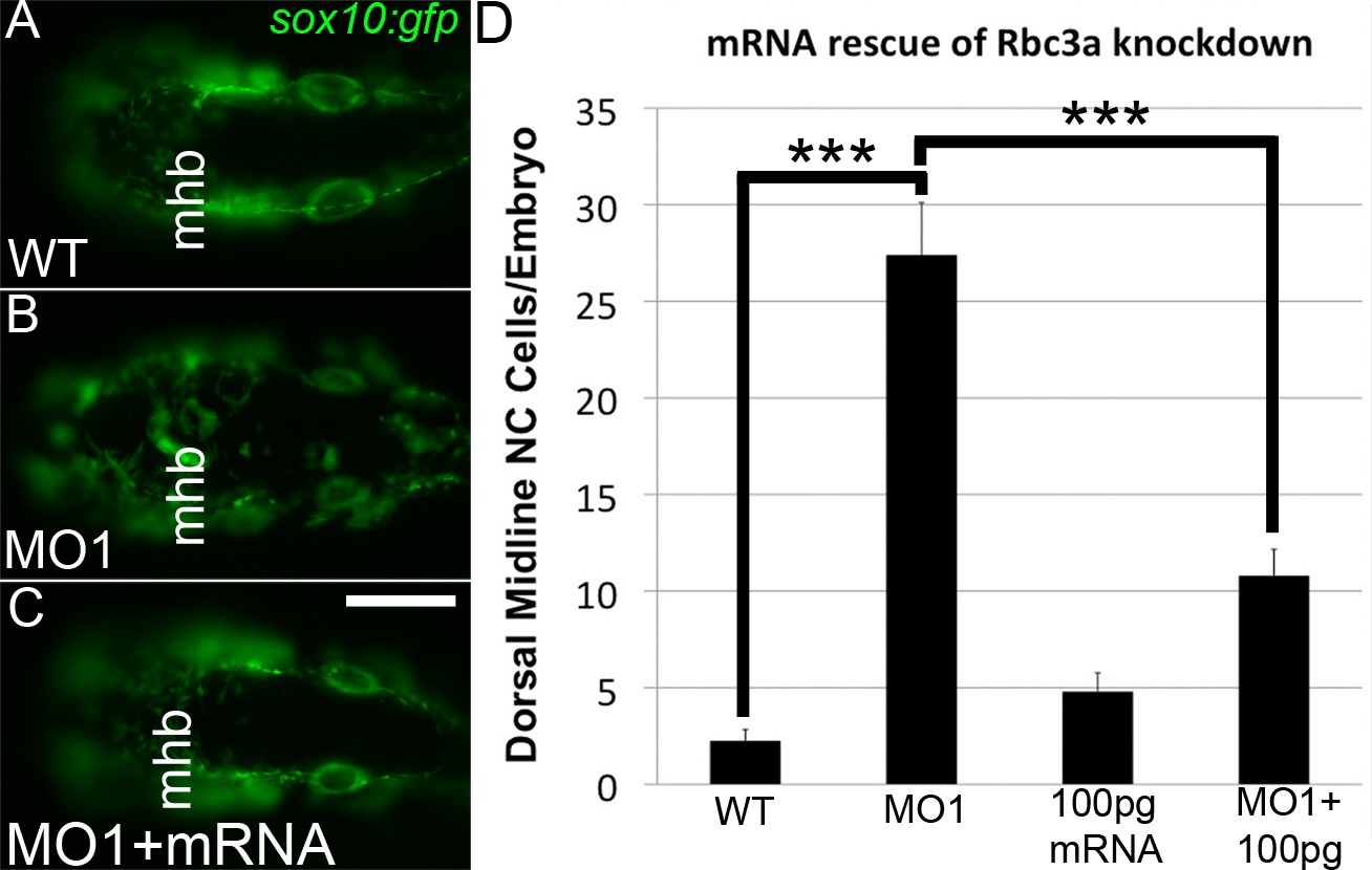 Rescue of rbc3a-MO1-injected embryos with full-length rbc3a mRNA. (A-C) Fluorescent images of live sox10:gfp transgenics, dorsal views, anterior to the left: (A) wild-type (WT), (B) rbc3a-MO1 injected, and (C) co-injected with full length rbc3a mRNA. (D) Number of GFP+ cells aggregated at the dorsal midilne at 24 hpf and located between the otic vesicle and MHB along the A-P axis. Injection of 100 pg rbc3a mRNA significantly rescued the number of GFP+ cells from 27.4±2.7 in rbc3a-MO1-injected embryos (n = 8) to 10.8±3.0 cells in mRNA+MO injected embryos (p<0.001, n = 8). Injection of 100 pg mRNA alone (n = 8) had no effect on the number of midline GFP+ cells compared to 2.3±1.7 in wild-type embryos (n = 9). Error bars represent ± SEM. Scale bar, 100 µm.