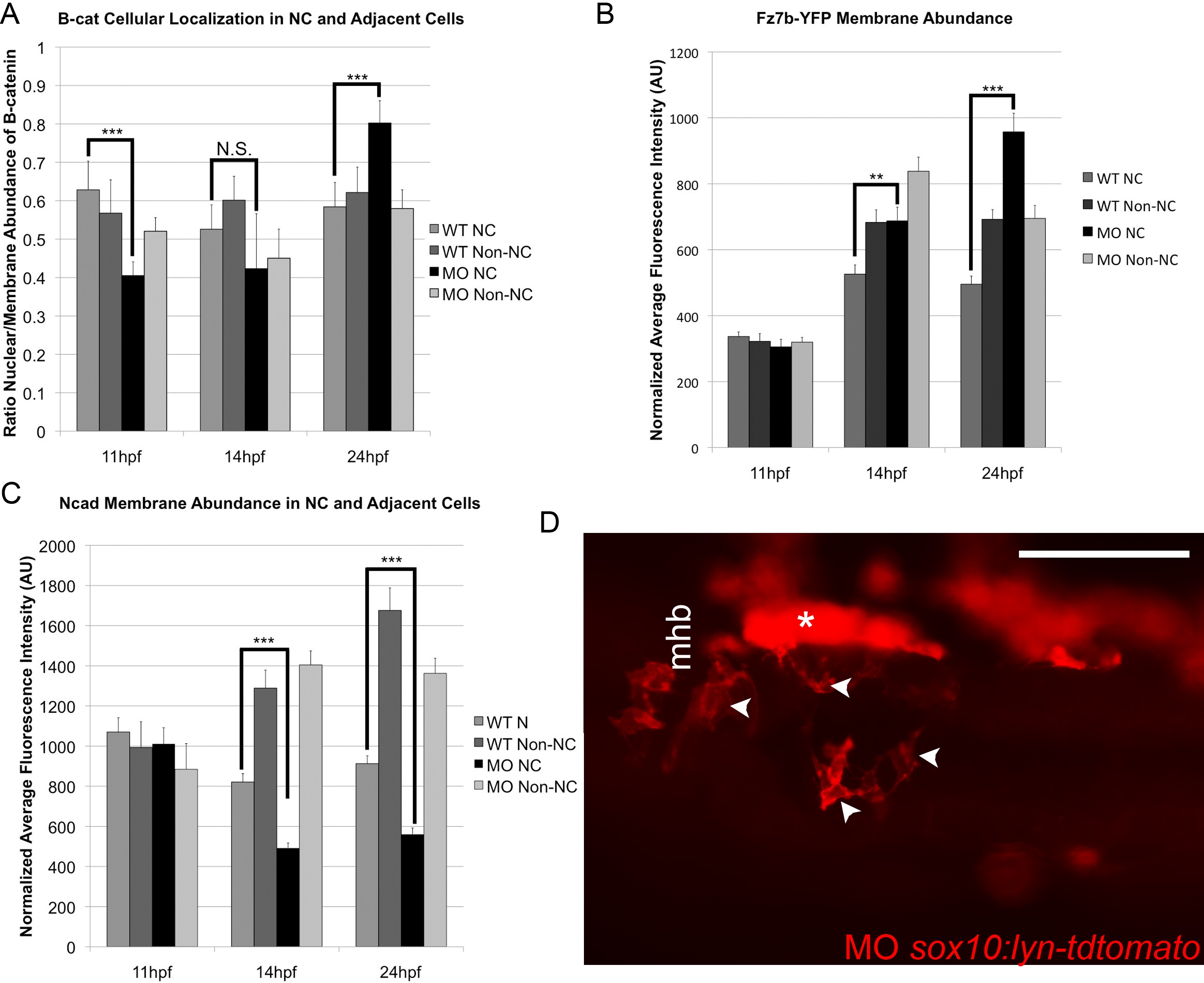 Cell autonomous effects of Rbc3a knockdown. (A-C) Quantification of subcellular localization of (A) Bcat, (B) Fz7b-YFP, and (C) Ncad in NC and non-NC cells. ** p<0.01, *** p<0.001, N.S., not significant. (D) Wild-type host embryo at 24 hpf with sox10:lyn-tdtomato cells (red) transplanted from a rbc3a-MO1-injected donor, dorsal view. A subset of rbc3a-deficient donor cells formed dorsal midline aggregates (white arrowheads), but many other cells migrated properly into the pharyngeal arches (asterisk). Mhb, mindbrain-hindbrain boundary. Scale bar, 100 µm.