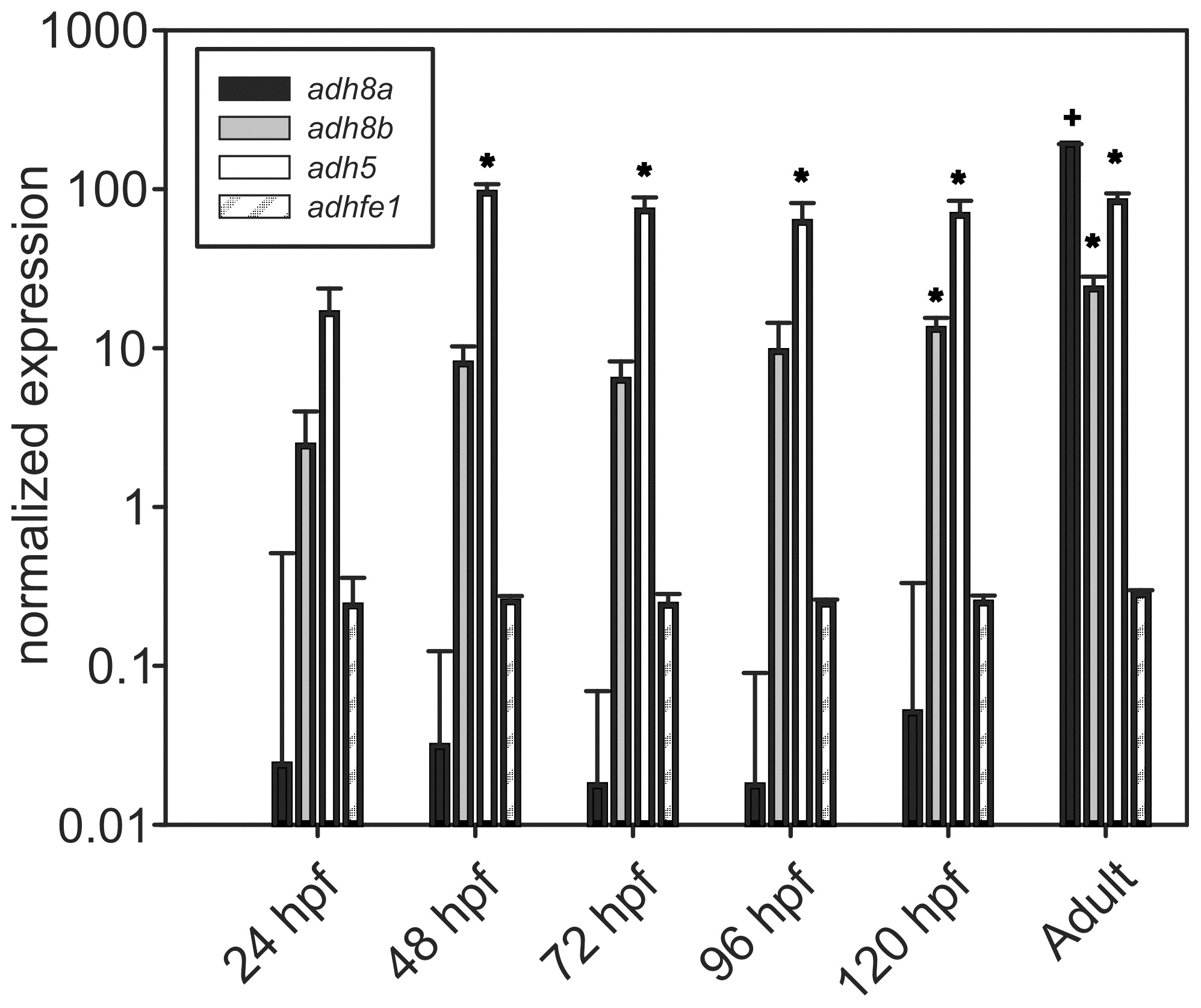 Developmental gene expression of different alcohol dehydrogenases (adh) in zebrafish embryos in comparison to adult female liver.