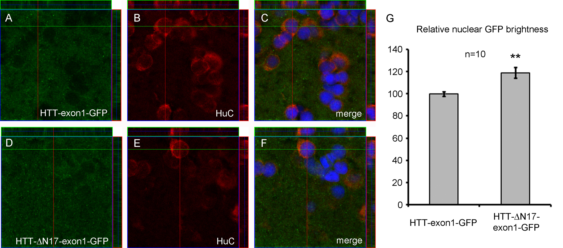 Ubiquitous HTT-exon1-GFP expression in HTT-exon1 and HTT-ΔN17-exon1 lines. 3D projections of confocal images of brain sections from HTT-exon1 L1 (A-C) and HTT-ΔN17-exon1 L1 (D-F) stained for GFP and HuC. Note the faint nuclear GFP staining in HTT while HTT-ΔN17-exon1 has brighter nuclear GFP. (G) Relative nuclear GFP intensity measurements in HuC+ cells comparing HTT-exon1-GFP versus HTT-ΔN17-exon1, n = 10 cells each, **p < 0.01, students t-test. Measurments were made using ImageJ and normalized to average GFP intensity across the entire area. HTT-exon1-GFP was arbitrarily set at 100 %. HTT-ΔN17-exon1 nuclei were approximately 20 % brighter.