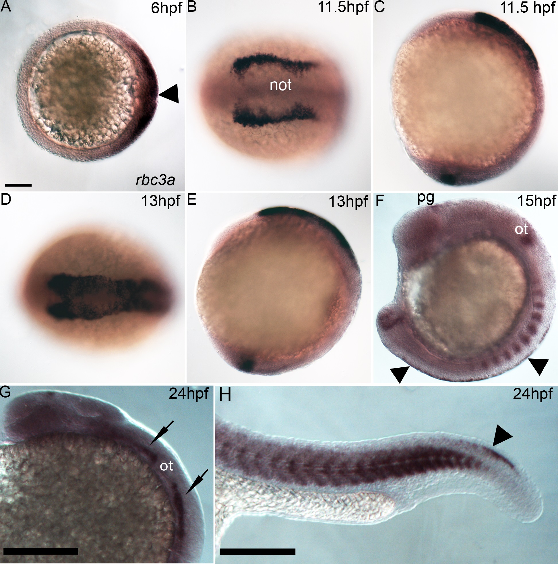 Whole mount in situ hybridization for rbc3a mRNA, anterior to the left. (A) Dorsal expression at gastrulation onset (6 hpf) includes the embryonic shield (arrowhead). Animal pole view, dorsal to the right. (B-E) Expression in NC cells starts at premigratory stages,11.5 hpf (B, C) and 13 hpf (D, E), with lower levels in the presumptive notochord (not) and in the tailbud (C, E). Dorsal views (B, D); lateral views (C, E). (F) Expression at 15 hpf in the pineal gland (pg), otic vesicle (ot), somites, tailbud, and premigratory NC (arrowheads) in the trunk. (G, H) Expression at 24 hpf in the pineal gland, cranial sensory ganglia (black arrows), somites, and tail NC (arrowhead). Scale bars, 100 µm.