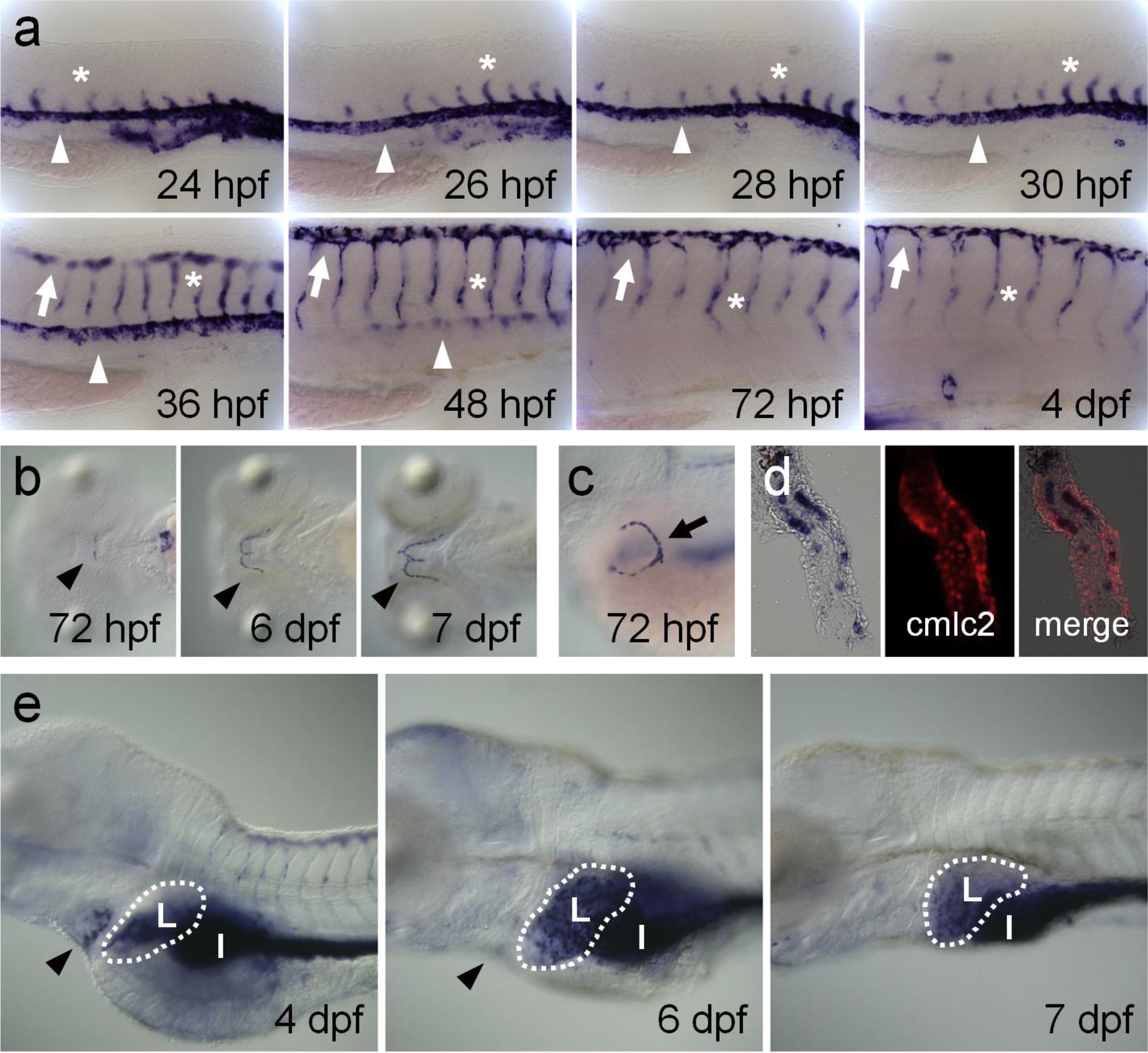 Spatiotemporal expression pattern of zaqp8a.1 in the vascular system and gastrointestinal tract. Lateral view with anterior to the left (a, c, e); ventral view with anterior to the left (b). (a) Expression of zaqp8a.1 in DA (arrowhead), ISV (asterisk), and DLAV (arrow). The zaqp8a.1 transcripts in DA and ISV gradually reduced at the anterior region of the trunk. (b) Expression of zaqp8a.1 in the hypobranchial artery (arrowhead). (c) The zaqp8a.1 transcripts were detected in the pectoral artery at 72 hpf (arrow). (d) The expression of zaqp8a.1 in the embryonic heart tube from 28 hpf Tg(cmlc2:EGFP) transgenic zebrafish embryos was detected by whole mount in situ hybridization and immunofluorescence staining. (e) The zaqp8a.1 is expressed in the heart (arrow head) and gastrointestinal tract, such as liver (L) and intestinal tract (I) at 4 to 7 dpf.