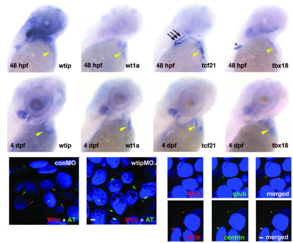 wtip expression is identical to PE-specific markers during zebrafish heart development. Lateral view of (A-D) 48 hpf and (E-H) 4 dpf whole-mount in situ hybridization of (A,E) wtip, (B,F) wt1a, (C,G) tcf21 and (D,H) tbx18. At 48 hpf, (A) wtip, and PE markers (B) wt1a-, (C) tcf21- and (D) tbx18- positive cells were in the clusters near the sinus venosus, between the atrium and the yolk and near the AV junction, in contact with the ventral surface of the heart (yellow arrowhead in A-D). At 48 hpf, tcf21 expression occurred in the pharyngeal arch (black arrows in C) and tbx18 expression occurred in the pectoral fin (black asterisk in D). By 4 dpf, the wt1a-, tcf21- and tbx18-positive cells spread over the heart to cover the myocardium (yellow arrowhead in F-H). By 4 dpf, wtip-, tcf21- and tbx18-positive cells appeared to spread over the heart to cover the myocardium along the dorsal surface of the heart (yellow arrowhead in E-H). (I,J) Double immunofluorescence for the cilia marker acetylated α-tubulin (green) and Wtip (red) in confocal projections of the zebrafish PE at 48 hpf. (J) No Wtip signal was detectable in wtipMO knockdown embryos, confirming antibody specificity. (K-P, red) Localization of Wtip in the basal bodies of cilia was confirmed by double immunostaining with Wtip antibody and either (L,M, green) anti-γ-tubulin or (O,P, green) anti-centrin, which are basal body markers in heart. 4′,6-diamidino-2-phenylindole was used to counterstain nuclei (blue). Scale bar=10 µm. wtip, Wilms tumor 1 interacting protein; PE, proepicardial organ; hpf, hours post-fertilization; dpf, days post fertilization; wt1a, Wilms tumor 1a; tcf21, transcription factor 21; tbx18, Tbox 18; wtipMO, wtip morpholino oligonucleotide; conMO, control MO; AT, acetylated α-tubulin.