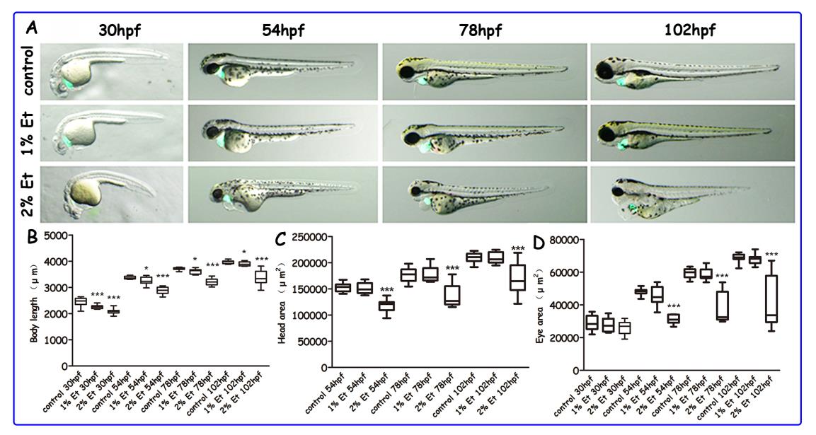 Phenotypic analysis of zebrafish Tg(cmlc2:egfp) embryos after early exposure of alcohol. (A) Lateral view of morphological characteristics of alcohol exposed larvae. (B) Statistical analyses for the body length of the larvae in untreated and alcohol treated groups. (C) Statistical analyses for the head area of the larvae in untreated and alcohol treated groups. (D) Statistical analyses for the eye area of the larvae in untreated and alcohol treated groups.