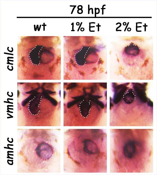 The effect of alcohol exposure on the expressions of amhc, vmhc and cmlc in zebrafish larvae at 78hpf.