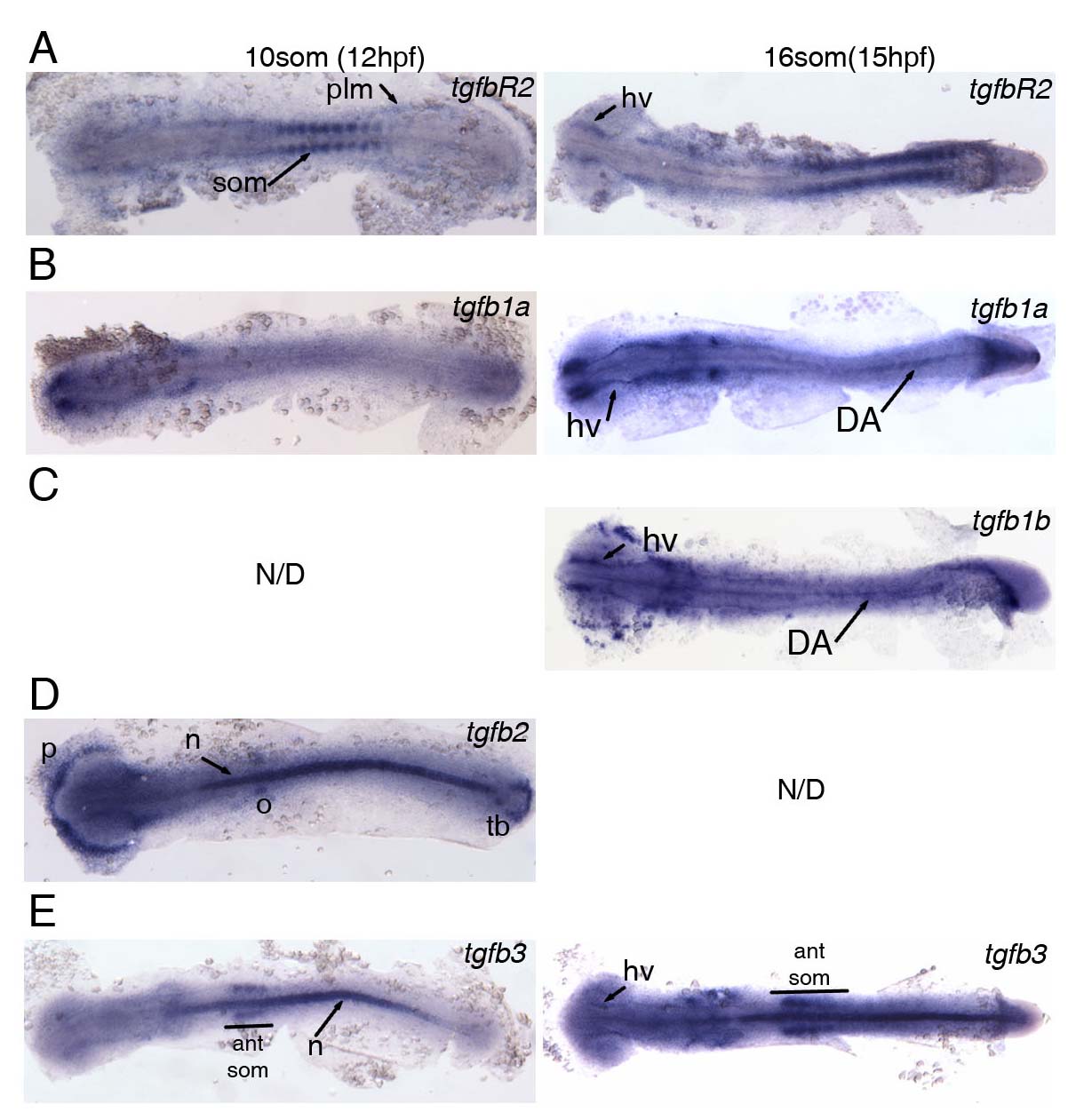 Expression of TGFβ signalling components at 12hpf (10somite stage) and 15hpf (16somite stage). All embryos were flatmounted for imaging. (A) Expression of tgfbR2 in the somites (som) and posterior lateral mesoderm (plm) at 12hpf. Expression of tgfbR2 at 15hpf in head vasculature (hv) and somites. (B) tgfb1a is not expressed in the posterior at 12hpf but is present in head vasculature from 12hpf and in the embryonic dorsal aorta (DA) at 15hpf. (C) tgfb1b is also present in the head vasculture and DA at 15hpf. Note that there is anterior expression of tgfb1b in cells that are likely myeloid. (D) tgfb2 is expressed in the polster (p), otic vesicles (o), notochord (n) and in the tailbud (tb) at 12hpf. (E) Expression of tgfb3 in the notochord and in the 4 anteriormost somites (ant som) at 12hpf. At 15hpf, the expression in the somites and notchord is maintained and weak expression in the head vasculature is observed.