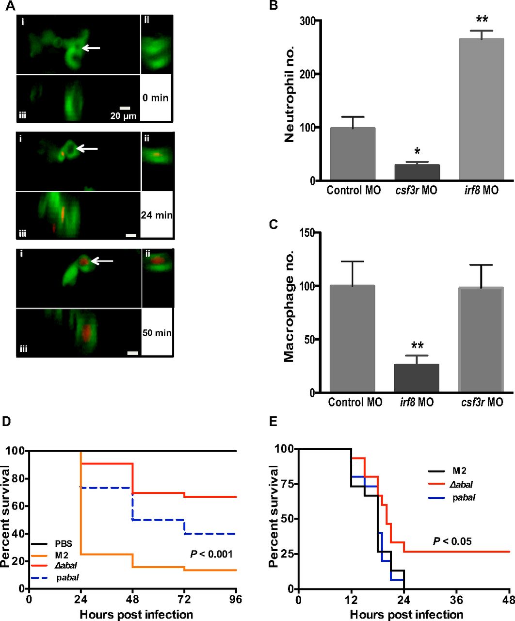 (A) After phagocytosis, A. baumannii is handled within acidic phagolysosomes as shown by the red fluorescence (pHrodo-dextran stain) within a neutrophilic vacuole (white arrow) at 50 min postinfection [Tg(mpx:GFP)il14 embryos with green fluorescent neutrophils were used]. In each panel, the maximum-projection z-stack image (i) is supplemented by x (ii) and y projections (iii). (B) Whole-embryo neutrophil numbers were counted using ImageJ at 48 hpf. Neutrophil numbers were decreased in csf3r MO-injected embryos and increased in irf8 MO-injected embryos (n = 15 per group pooled from three independent experiments; error bars represent mean ± SD). (C) Whole-embryo macrophage numbers were counted by using ImageJ at 48 hpf. Macrophage numbers were decreased in irf8 MO-injected embryos and were unchanged in csf3r MO-injected embryos. Asterisks represent comparison between control MO and csf3r MO or irf8 MO (n = 15 per group pooled from three independent experiments; error bars represent mean ± SD; *P ≤ 0.05 and **P < 0.01, one-way ANOVA, Kruskal-Wallis test). (D) Zebrafish infected with the Acinetobacter quorum-sensing mutant (ΔabaI) showed greater survival compared with wild-type Acinetobacter (M2 strain) and the complemented strain (pabaI) in zebrafish (P value is a comparison of M2 and ΔabaI) and (E) a murine septicemia model (n = 15 per group; P value is a comparison of M2 and ΔabaI by log-rank test).