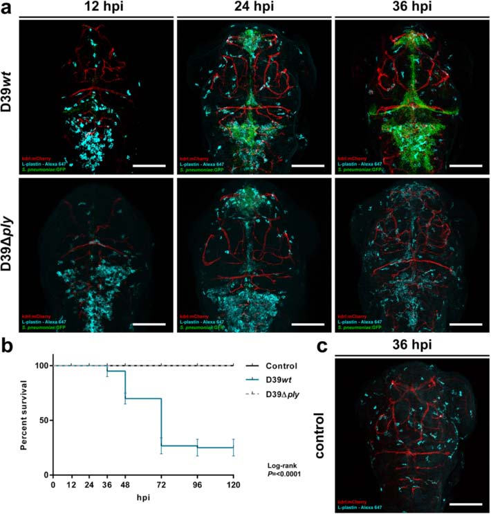 Comparison of 2 days post-fertilization zebrafish embryos infected with wild-type Streptococcus pneumoniae D39 (D39wt) or pneumolysin-deficient mutant strain (D39Δply). a Confocal microscopy images at maximum projection of Tg(kdrl:mcherry) s896 zebrafish embryos infected with D39wt or D39Δply at different time points. c Non-infected zebrafish embryos. D39wt pneumococci grow rapidly compared to D39Δply and migrate throughout the subarachnoid space, delineating the ventricular contours. The numbers of phagocytes reduce over time in the presence of increasing numbers of D39wt bacteria compared to non-infected or D39Δply zebrafish embryos. Embryos were infected with 600 CFU. Scale bars, 100 µm. b Corresponding survival curves. Embryos were infected with 300 CFU. The data represent three individual experiments with 20 embryos in each group