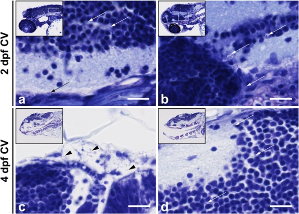 Histopathological analysis of Streptococcus pneumoniae-infected zebrafish embryos via the caudal vein at 2 days post - fertilization. a, b Caudal vein injection at 2 days post - fertilization (dpf). Sagittal section of the head region showing the bacteria (arrows) in the brain parenchyma at a 12 h post injection (hpi) and at b 24 hpi. c, d Caudal vein-injected zebrafish embryos at 4 dpf. c Sagittal section at 24 hpi showing bacteria (arrows) in the meningeal space and in d the brain parenchyma. Scale bars, 10 µm
