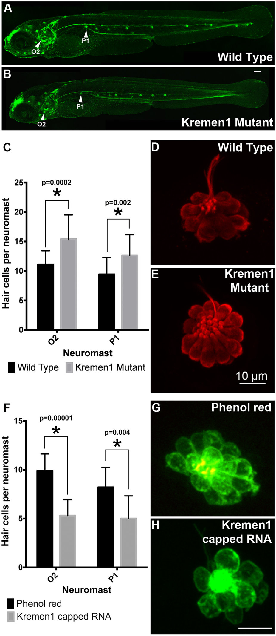 (A) A lateral view of a whole mount fish expressing Tg(cldnB:GFP). This fish has wild type distribution of neuromasts. Neuromasts O2 and P1 are labelled. (B) A lateral view of a whole mount fish mutant for Kremen1 and expressing Tg(cldnB:GFP). This fish has fewer neuromasts in the posterior tail region. Neuromasts O2 and P1 are labelled. Images provided by Drs H. McGraw and A. Nechiporuk. (C-E) Kremen1 mutants have excess hair cells per neuromast. (C) Mutants have a significant increase in hair cells in neuromasts O2 and P1. Asterisk (*) indicates p < 0.005. Hair cells (Parvalbumin, red) in neuromast O2 of a wild type fish (D) or a Kremen1 mutant fish (E). (F-H) Kremen1 over expression reduces hair cell numbers. (F) Fish injected with Kremen1 capped RNA have fewer hair cells per neuromast than control (phenol red) injected fish, asterisk (*) denotes p < 0.005. Hair cells (GFP) in neuromast P1, of a control injected (G) or Kremen1 capped RNA injected (H) fish. Scale bar indicates 10 µm. All error bars represent standard deviation.