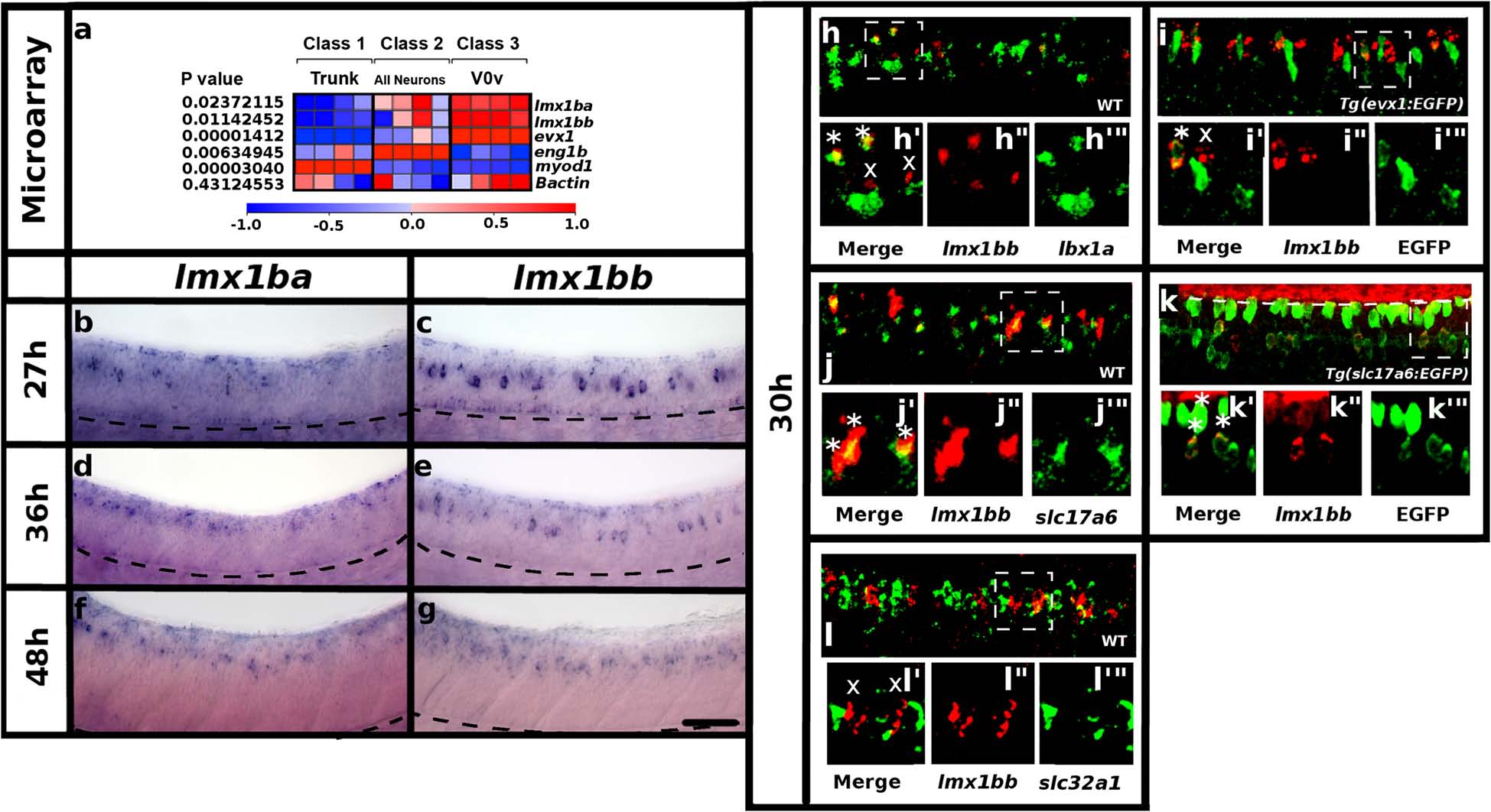 lmx1b expression in zebrafish spinal cord. a Three-class ANOVA comparison of V0v cells (class 3), trunk cells (class 1) and all post-mitotic neurons (class 2). p values test hypothesis that there is no differential expression among the 3 classes. Columns represent individual microarray experiments. Rows indicate relative expression levels as normalized data, subjected to a Z-transformation where mean = 0 and standard deviation = 1, where red = normalized expression value of +1 and blue = normalized expression value of -1 (see Methods for more details). lmx1ba and lmx1bb are expressed by V0v neurons. Positive control evx1 is also expressed by V0v neurons. Negative controls eng1b and myod1 are expressed by other neurons (V1 cells) and trunk cells respectively. ²actin is a housekeeping gene that is expressed by all populations. b-l Lateral views of zebrafish spinal cord at 27 h (b and c), 30 h (h-l), 36 h (d and e) and 48 h (f and g). Anterior left, dorsal top. in situ hybridization for lmx1ba (b, d and f) and lmx1bb (c, e and g). Black dashed line (b-g) is just below ventral limit of spinal cord, floor plate is right above this, in the most ventral part of the spinal cord, roof plate is the most dorsal part of the spinal cord. Double in situ hybridization for lmx1bb (red) and lbx1a (green) in WT embryo, merged view (h) and magnified single confocal plane of white dotted box region (h′-h′′′). in situ hybridization for lmx1bb (red) and EGFP immunohistochemistry (green) in Tg(evx1:EGFP) SU1 embryo, merged view (i) and magnified single confocal plane of white dotted box region (i′-i′′′). Double in situ hybridization for lmx1bb (red) and slc17a6 (green) in WT embryo, merged view (j) and magnified single confocal plane of white dotted box region (j′-j′′′). in situ hybridization for lmx1bb (red) and EGFP immunohistochemistry (green) in Tg(slc17a6:EGFP) embryo, merged image (k) and magnified single confocal plane of white dotted box region (k′-k′′′). White dashed line (k) marks the dorsal limit of the spinal cord. Red staining above the dashed line is outside the spinal cord. Double in situ hybridization for lmx1bb (red) and slc32a1 (green) in WT embryo, merged image (l) and magnified single confocal plane of white dotted box region (l′-l′′′). In all cases (h-l) * indicates co-labeled cell, x indicates single labeled lmx1bb-expressing cell. In all cases, at least two independent double-labeling experiments were conducted (h-l). Results were similar for each replicate. Numbers of single and double-labeled cells and number of embryos counted are provided in Tables 1 and 2. Scale bar = 50 µm (b-g), 70 µm (h-l) and 20 µm (h′-l′′′)