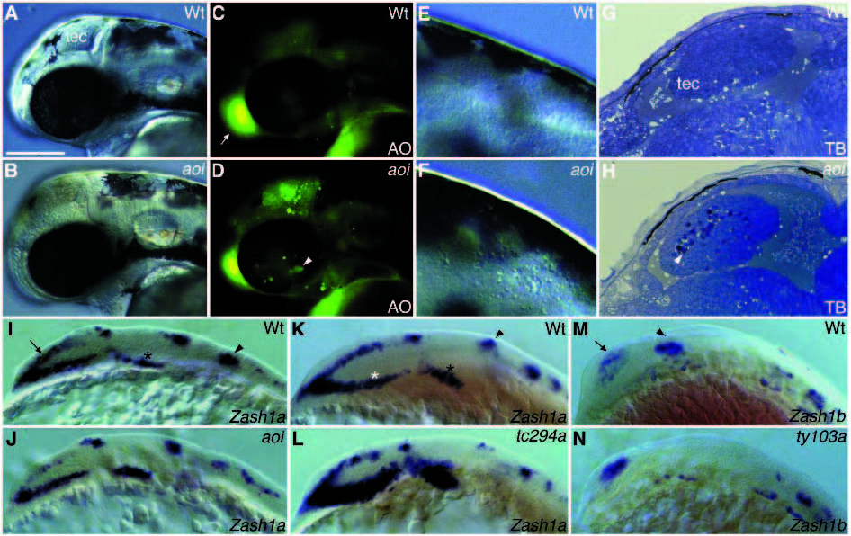 Class I mutant phenotypes. (A,C,E,G,I,K,M) Wild type; (B,D,F,H,J) aoi, (L) tc294a and (N) ty103a. (A-H) at 36 h; (I-L) at the 10- somite stage and (M,N) at the 15-somite stage. (C,D) Acridine orange (AO)-stained embryos of (A,B) respectively. (G,H) Parasagittal section of the tectum stained with toluidine blue. In situ hybridization with Zash 1a probe (I-L) and with Zash 1b probe (M,N). Apoptotic cells are indicated by white arrowheads. In aoi mutants apoptotic cells are present in the tectum (D,H arrowhead), cerebellar fold, dorsal hindbrain (F) and the neural retina (D arrowhead). Normal olfactory epithelium is stained with acridine orange (C, arrow). (I,J) The dorsal forebrain expression (arrow) and rhombomere 2 expression of Zash 1a (arrowhead) are reduced in aoi mutants whereas ventral midbrain expression (black star) is increased; (K,L) the ventral forebrain expression (white star), tegmentum expression (black star) are increased whereas the midbrain-hindbrain boundary expression of Zash 1a (arrowhead) is reduced in tc294a embryos; (M,N) the telencephalic expression of Zash 1b (arrow) is increased in contrast to the absence of its midbrain expression (arrowhead) in ty103a. Scale bar, approximately 100 µm in A-D and IN; 200 µm in E and F; 300 µm in G and H.